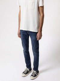 Tight fit stretch jeans in a splendid dark wash with contrasting wear. Made from organic cotton. Size & Fit Model is wearing size: W30" L30" Model's height: 184 cm / 6’0.5” Details - Organic cotton - 12.25 oz. power stretch denim - Light Tobacco thread at seams - Light Tobacco and Navy thread at inseam - Navy back pocket embroidery - Copper trims - Zip fly - Jacron patch - Tight fit - Low waist - Tight Leg - Tight leg opening 99% Cotton 1% Elastane Made in TN Tight fit jeans made in organic power stretch denim. These jeans have been washed to a splendid deep dark hue. Soft abrasions and contrasting wear marks add an electric highlight and a slight yarn slub adds subtle details throughout the jeans. It is these details, the contrast between deep and electric indigo, that makes these jeans pop.