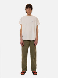 Loose-fit four-pocket pants with vintage workwear making. Made in organic cotton twill with great texture. Size & Fit Model is wearing size: W30''L30'' Model's height: 186 cm / 6'1'' Details - Organic cotton - 9.4 oz rigid twill - Matching threads - Corozo buttons - Button fly - Four pockets - Woven patch - Loose fit - High waist - Wide leg - Wide leg opening 100% Cotton Made in TN Loose-fit four-pocket worker pants with a wide leg made in organic cotton twill. These pants are crafted from a medium-weight twill with a pronounced diagonal structure that has a coarse and slightly uneven surface structure. The Tuff Tony Pants is inspired by simplistic workwear pants. As such, they feature two slanted front pockets and two patch-on back pockets. They are sewn with medium thread thickness with a short stitch length that, along with the fabric, gives the pants a well-crafted and vintage-like look.