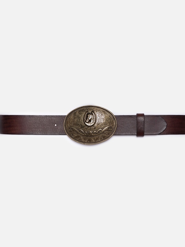 Classic western-style belt made from vegetable-tanned full-grain leather with ornamented buckle. Details - Vegetable-tanned full-grain leather - Width 38 mm - Ornamented buckle - Size is in centimeters and measured from the buckle pin to the middle hole. 100% Leather Made in PL A Western-style belt featuring a beautifully ornamented buckle. Crafted from 38 mm wide vegetable-tanned full-grain leather and a sturdy buckle, this belt showcases quality craftsmanship, intricate detail, and exceptional aging properties.