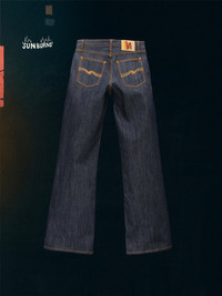 Details - Regenerative Organic cotton - 14.2 oz. rigid denim - Orange thread at seams - Sunburns gradient back pocket embroidery - Copper trims - Jacron patch - Zip fly - Jacron patch - Loose fit - Low waist - Wide leg - Wide leg opening Wide Heidi Dry Sunburns makes its mark with a bold gradient back pocket embroidery, shifting from deep orange to pale yellow, with our own Nudie Jeans Orange at the center. Paired with a special graphic Jacron patch, it subtly plays with our identity and iconography. Beneath it all lies a proprietary 14.2 oz denim, developed exclusively for Nudie Jeans. Woven with Regenerative Organic Cotton, it revives the raw, textured character of a pair of ‘90s jeans we once stumbled upon. Though undeniably "modern," these jeans are rooted in a transitional era—a time when vintage ring-spun textures resurfaced, and select denim mills strayed from pure efficiency in pursuit of true vintage aesthetics. A defining moment—just before Nudie Jeans was born. The wide-leg, high-waist silhouette of Wide Heidi brings a sense of effortless volume, reinforcing the denim’s sturdy, substantial feel. Stiff and unapologetic in its raw form, it breaks in with deep creases and sharp wear marks, gradually revealing the full depth of its warp streakiness. Over time, the interplay of slub, clean twill lines, and subtle marbling comes into its own—a denim built to become tomorrow’s vintage.