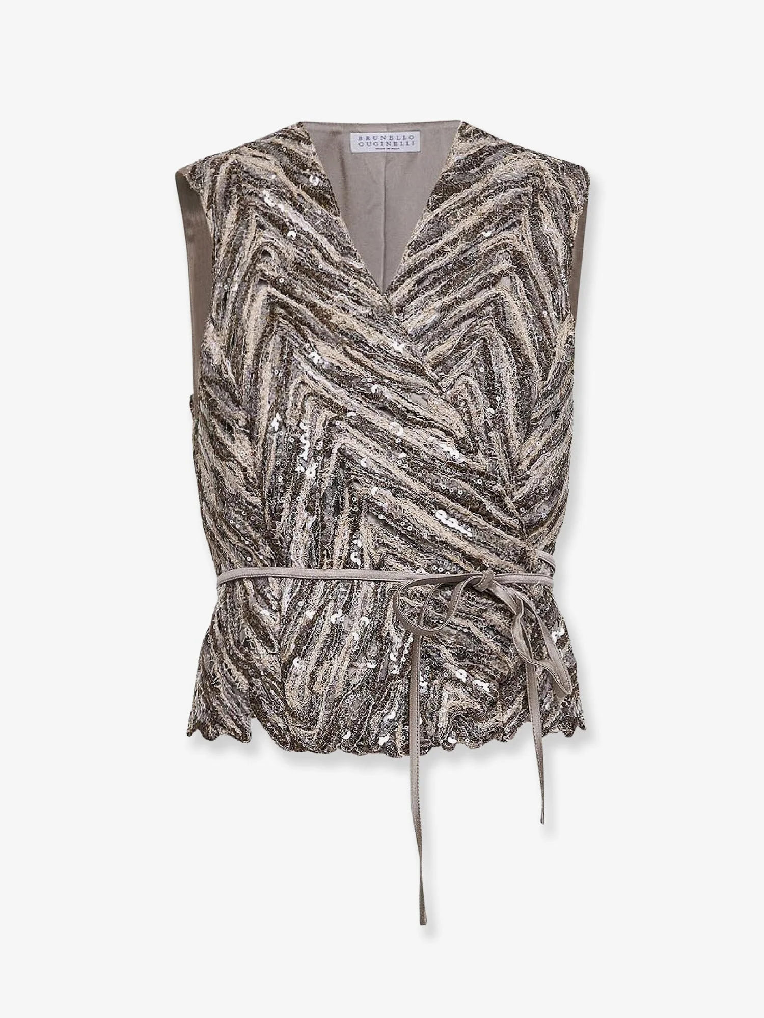 Dazzling chevron embroidery vest in paper yarn, linen and silk