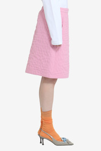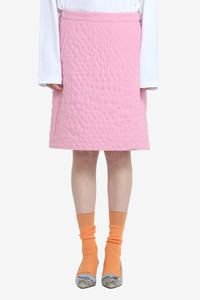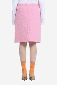 Above-the-knee wrap skirt made of textured fabric with a textured pattern. The piece features a straight fit and a wrap-around front closure. The elastic back ensures comfort and a snug fit. DETAILS Color: Pink Composition: 60%PL 40%VI Product Code: 25IN2M0C08151594141 Made in Italy SIZE AND VESTIBILITY The model wears size 40. The garment fits regular.