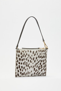 The animalier effect shoulder clutch is made of brown spotted print material on a white background. It has a rectangular shape with a top zip closure and a single black leather handle with gold metal finishes. The construction is minimalist and compact, suitable for practical and versatile use. DETAILS Color: Animal External composition: 100% CALF LEATHER Product Code: 25IBP0990CD01X001 Made in Italy SIZE AND VESTIBILITY Dimensions: 23x17x2