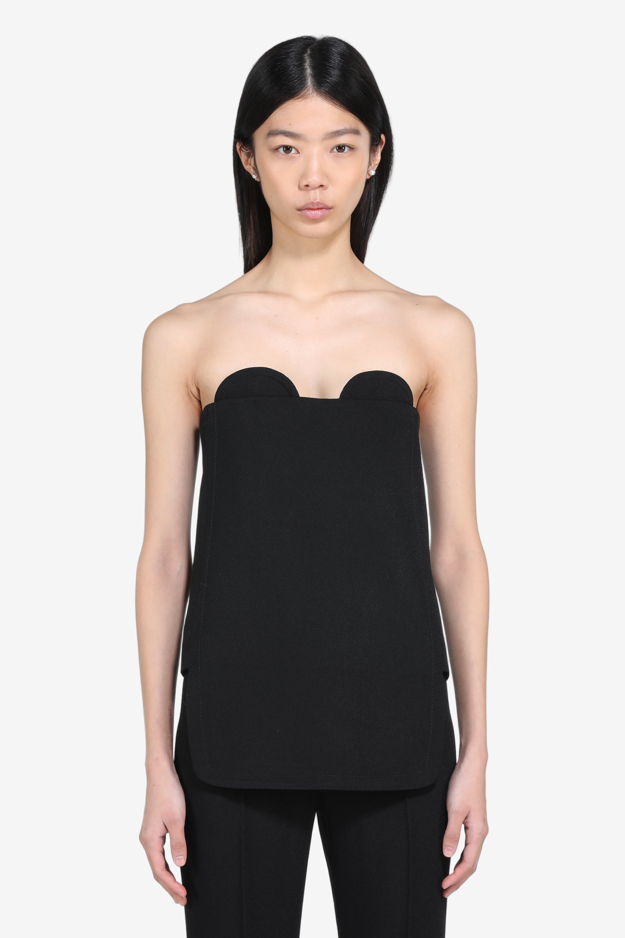 Bandeau top made of black fabric. It features a fitted, strapless fit with a distinctive neckline. The back zip closure ensures a secure fit. The garment's construction features a clean, minimalist design, ideal for formal occasions or elegant evenings. DETAILS Color: Black Composition: 100% VI Product Code: 25IN2S0T01150759000 Made in Italy SIZE AND VESTIBILITY The model wears size 40. The garment fits regular.