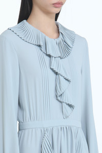 Knee-length dress made of lightweight, flowing light blue fabric. It features a pleated collar and decorative ruffles along the front and on the cuffs of the long sleeves. The fit is loose and slightly flared, with a waist defined by a matching belt. The back closure features a small button closure. DETAILS Color: Sugar Paper Composition: 69% AC 31% SE Product Code: 25IN2M0H09151116619 Made in Italy SIZE AND VESTIBILITY The model wears size 40. The garment fits regular.
