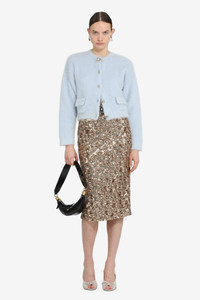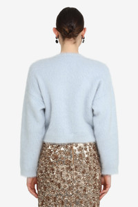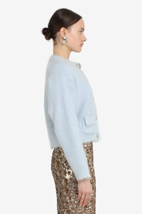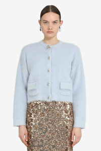 Crew-neck cardigan made of soft, slightly fuzzy light blue fabric, featuring a front button closure that adds a bright, distinctive detail. The model features a regular fit, long sleeves, and two front flap pockets. DETAILS Color: Light Blue Composition: 52%WM 44%PA 4%WO Product Code: 25IN2M0A01970866536 Made in Italy SIZE AND VESTIBILITY The model wears size 40. The garment fits regular.