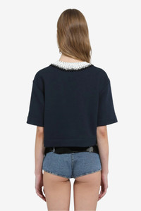 Black cotton short polo shirt with short sleeves and collar decorated with beads and sequins. DETAILS Color: Blue Composition: 95%CO 3%PL 2%CZ Product Code: 25IN2C0E02140896479 SIZE AND VESTIBILITY The model wears size 40. The item fits regular.
