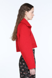 This cropped, zip-up cardigan in knit fabric features a relaxed fit and long sleeves. The vibrant red color adds a touch of vivacity to your outfit. Featuring a wide collar and ribbed details, it's ideal for layering over tops or shirts. The front zip closure makes it easy to wear and practical. Perfect for a casual, modern look. DETAILS Color: Red Composition: 30%WO 28%VI 15%WP 15%PC 12%PU Product Code: 25IN2S0A02371124608 Made in Italy SIZE AND VESTIBILITY The model wears size 40. The item fits oversized.