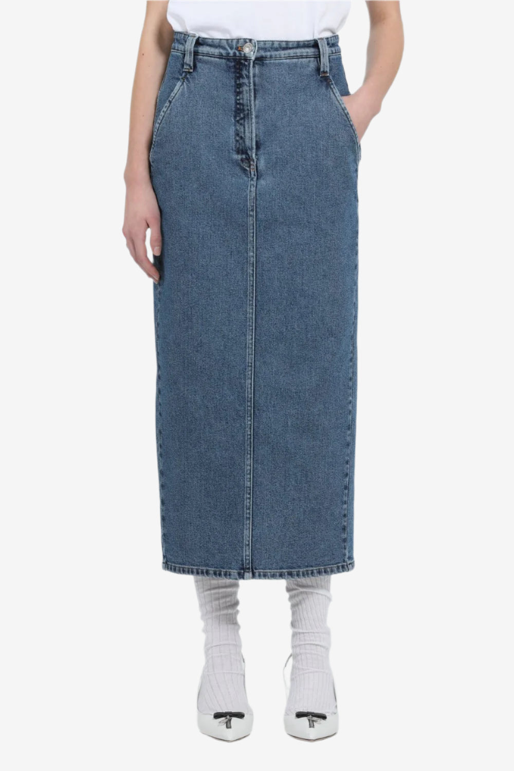 Long denim skirt with side pockets and front zip and button closure. Straight line. Belt loops at the waist. DETAILS Color: Indigo Composition: 98%CO 2%EA Product Code: 25IN2C0C03100516001 SIZE AND VESTIBILITY The model wears size 40. The item fits regular.