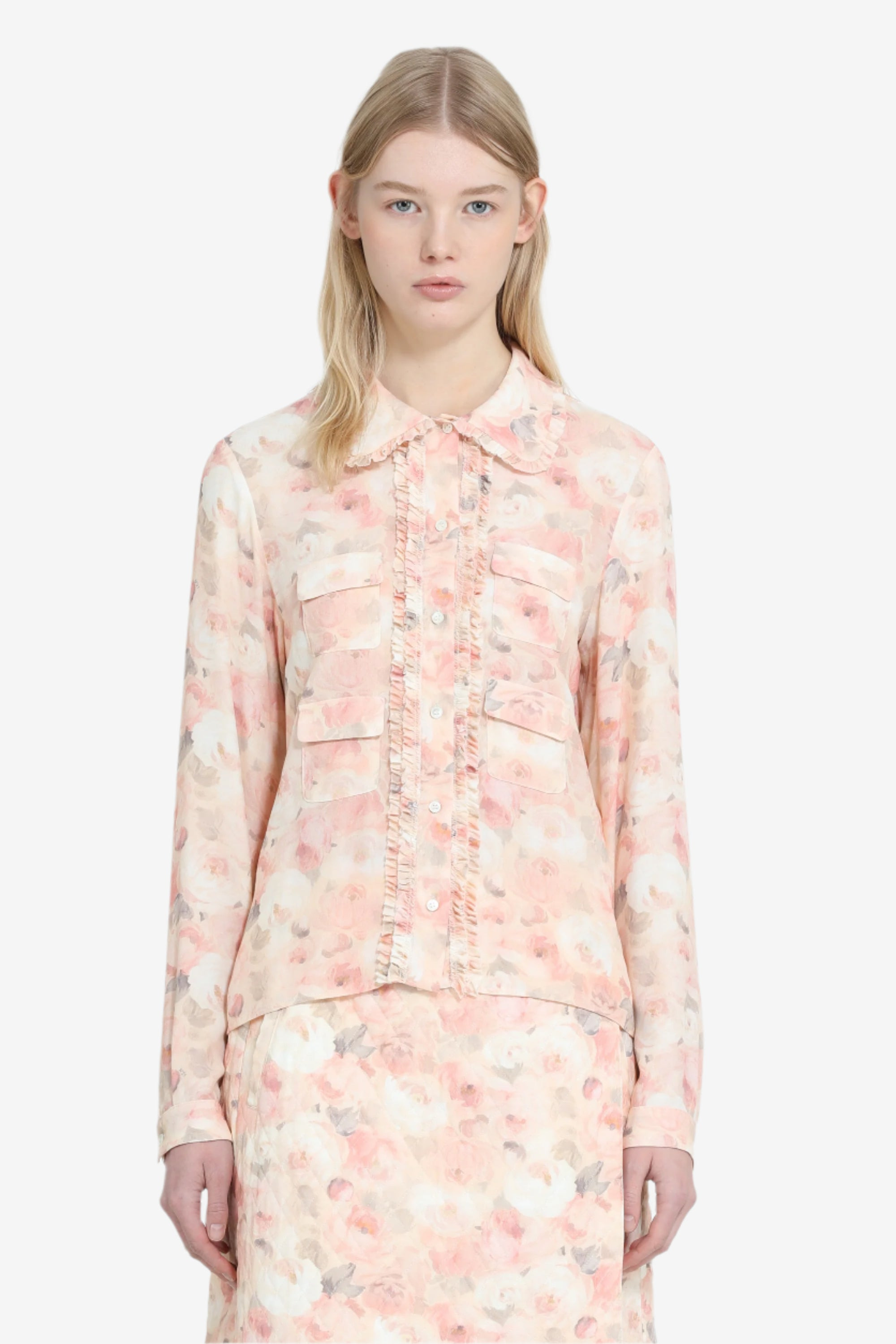 Floral shirt with mini ruffles and pockets made of light and soft fabric. It features a floral pattern in shades of pink and beige, a classic collar and a front button closure. The fit is regular, with long sleeves and pleated details along the button placket and collar. The shirt includes four small patch pockets on the front. DETAILS Color: Butter Background Print Composition: 100%VI Product Code: 25IN2M0G0525263SAR1 Made In Italy SIZE AND VESTIBILITY The model wears size 40. The garment fits regular.