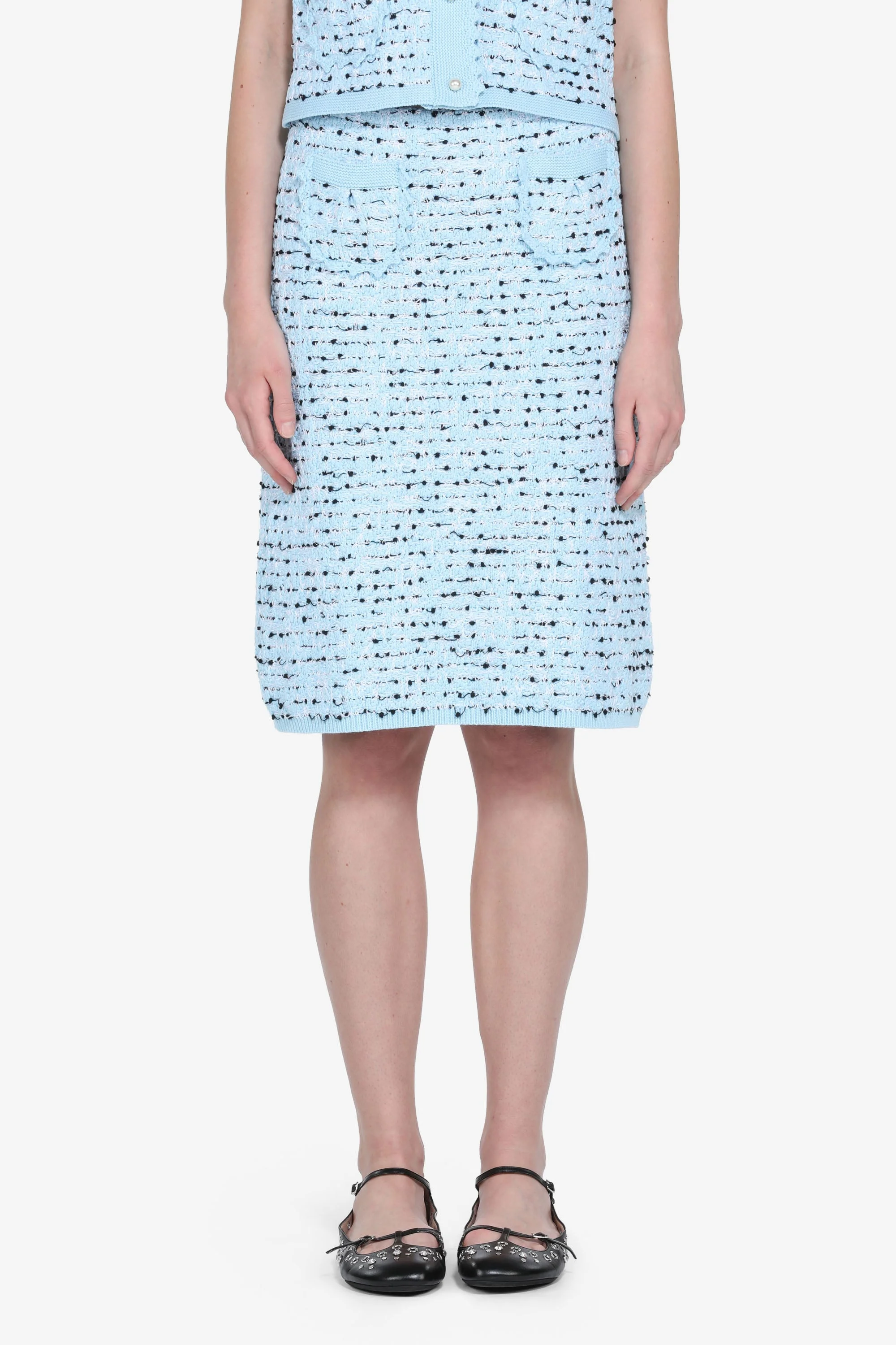 Knee-length skirt in light blue boucle knit. The fabric is knitted with dark yarns that create a tweed-like pattern. The fit is straight and the waist is finished with a ribbed band. The length reaches the knee and the finishes are clean. DETAILS Color: Light Blue Composition: 75%CO 23%PA 2%PC Product Code: 26EN2M0AC0276016255 Made in Italy SIZE AND VESTIBILITY La modella indossa la taglia 40 ed e alta 177 cm. Il capo veste regular.