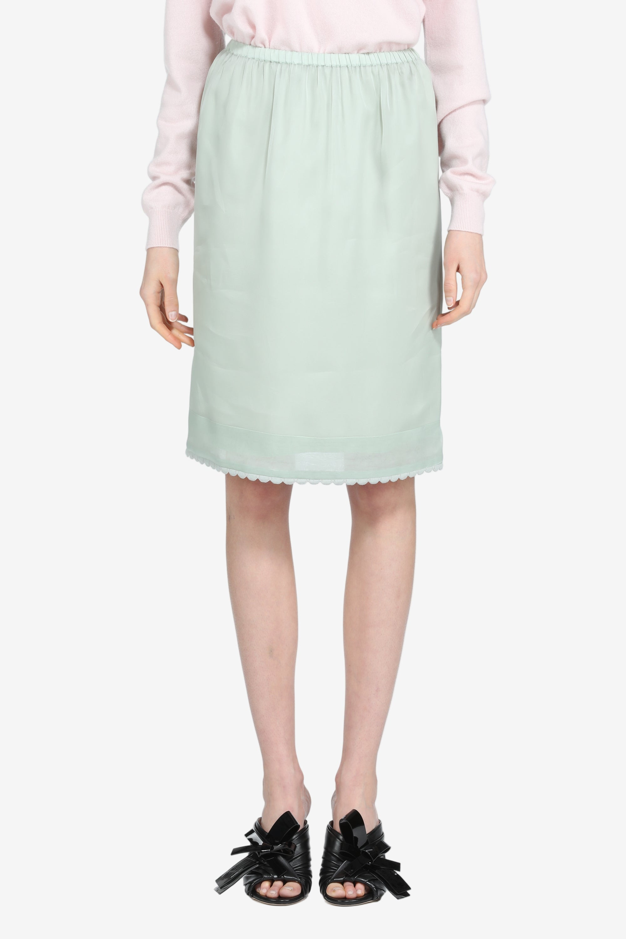 Knee-length skirt in lightweight fabric, made with an elastic waistband for a comfortable fit. The skirt features a simple, clean design with a decorative hem. It comes in a light green shade, ideal for a variety of occasions. DETAILS Color: Mint Composition: 100% SE Product Code: 25IN2S0C03155765257 Made in Italy SIZE AND VESTIBILITY The model wears size 40. The garment fits regular.
