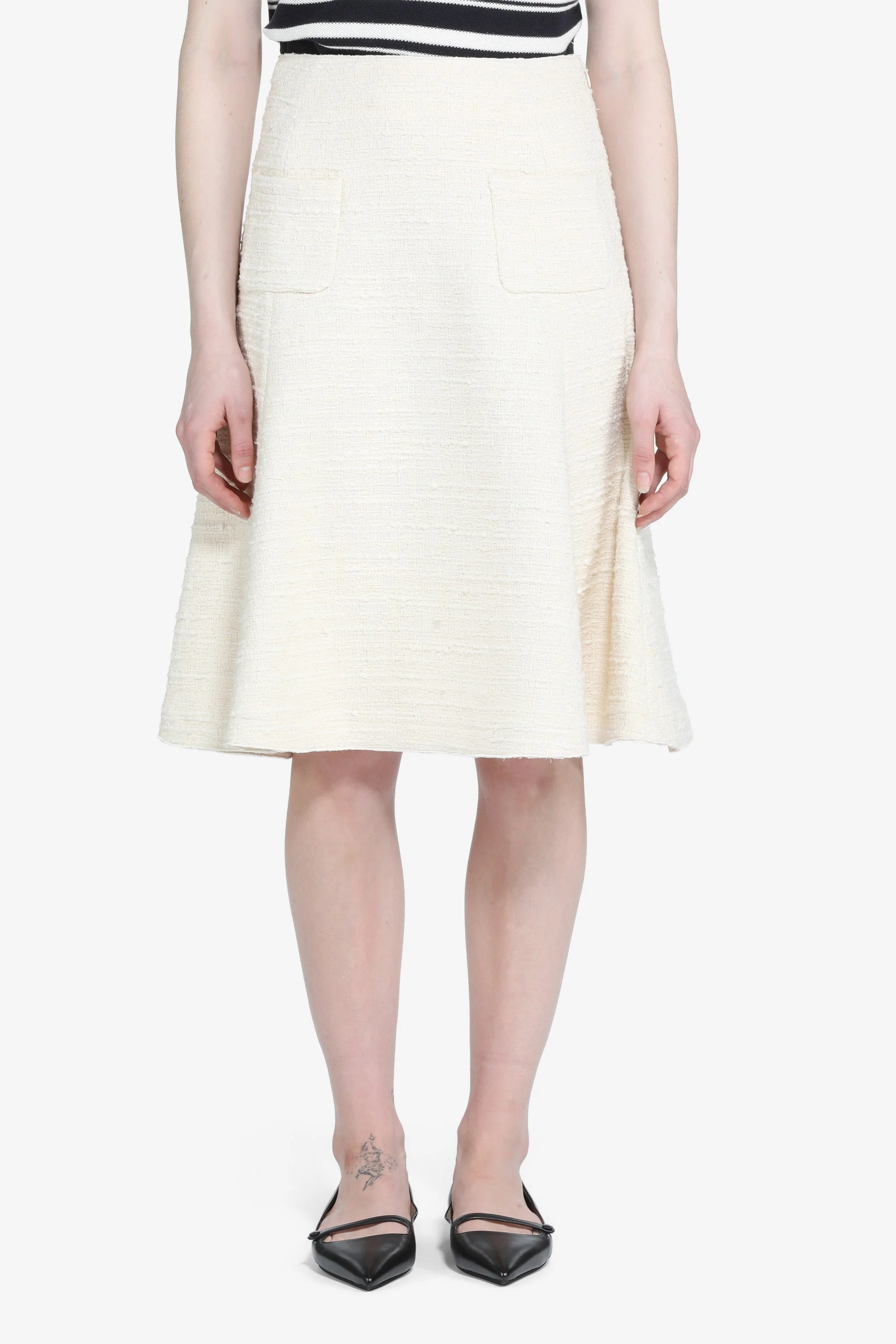 Cream textured knee-length A-line skirt with a high waist. Crafted from a structured fabric with a clean finish, it features two front patch pockets. The silhouette is neutral and suitable for simple outfits. DETAILS Color: Cream Composition: 97%CO 2%PL 1%PA Product Code: 26EN2M0C07102481115 Made in Italy SIZE AND VESTIBILITY The model wears size 40 and is 175 cm tall. The boss fits regular.