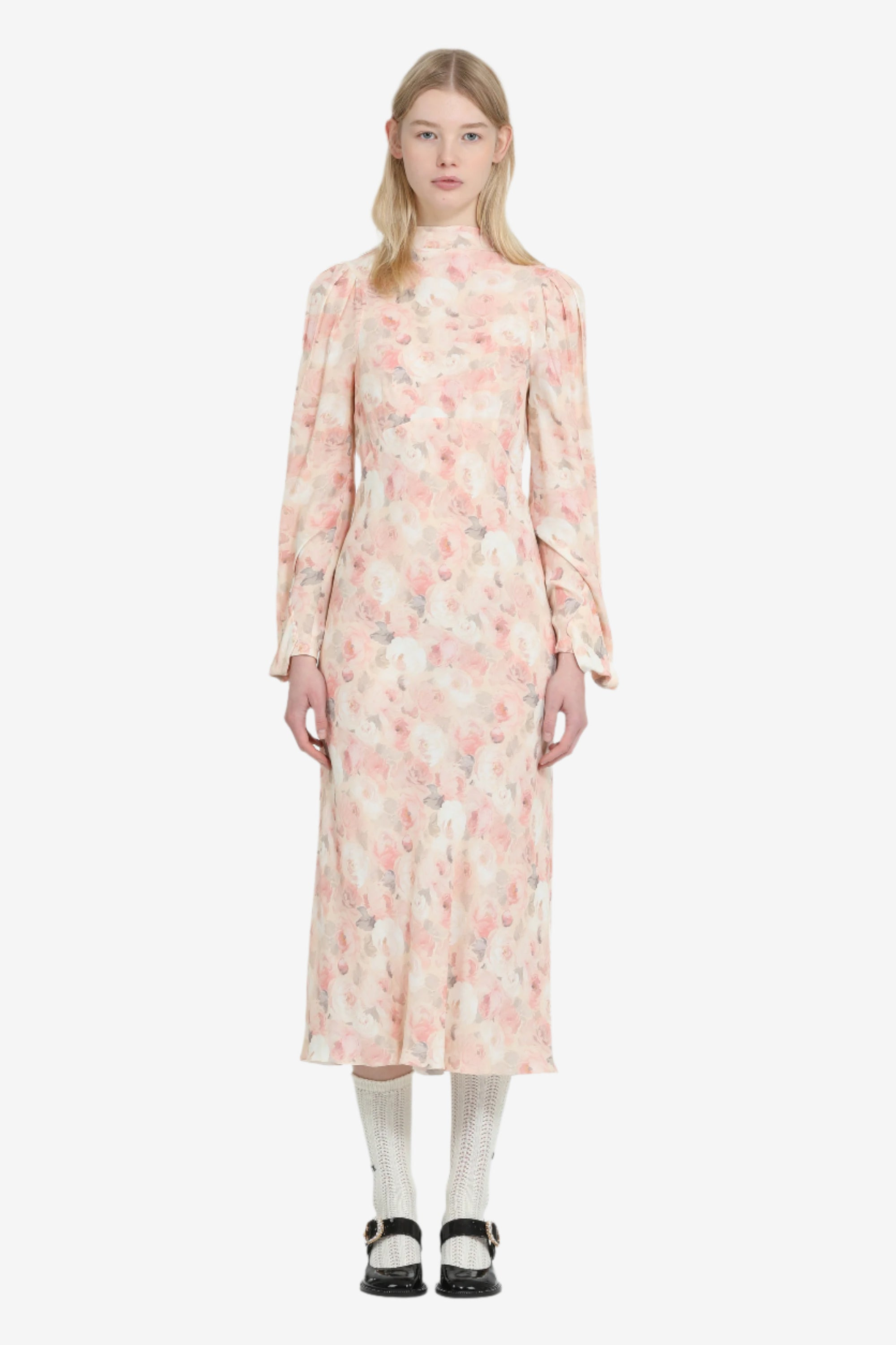 Long dress made of lightweight fabric with a floral print in shades of pink and beige. It features long flared sleeves with gathers on the shoulders and a fitted cut that follows the silhouette. The model has a high neckline on the front and a V-neck on the back with a central fastening. The length reaches below the knee. DETAILS Color: Butter Background Print Composition: 100%VI Product Code: 25IN2M0H0725263SAR1 Made In Italy SIZE AND VESTIBILITY The model wears size 40. The garment fits regular.