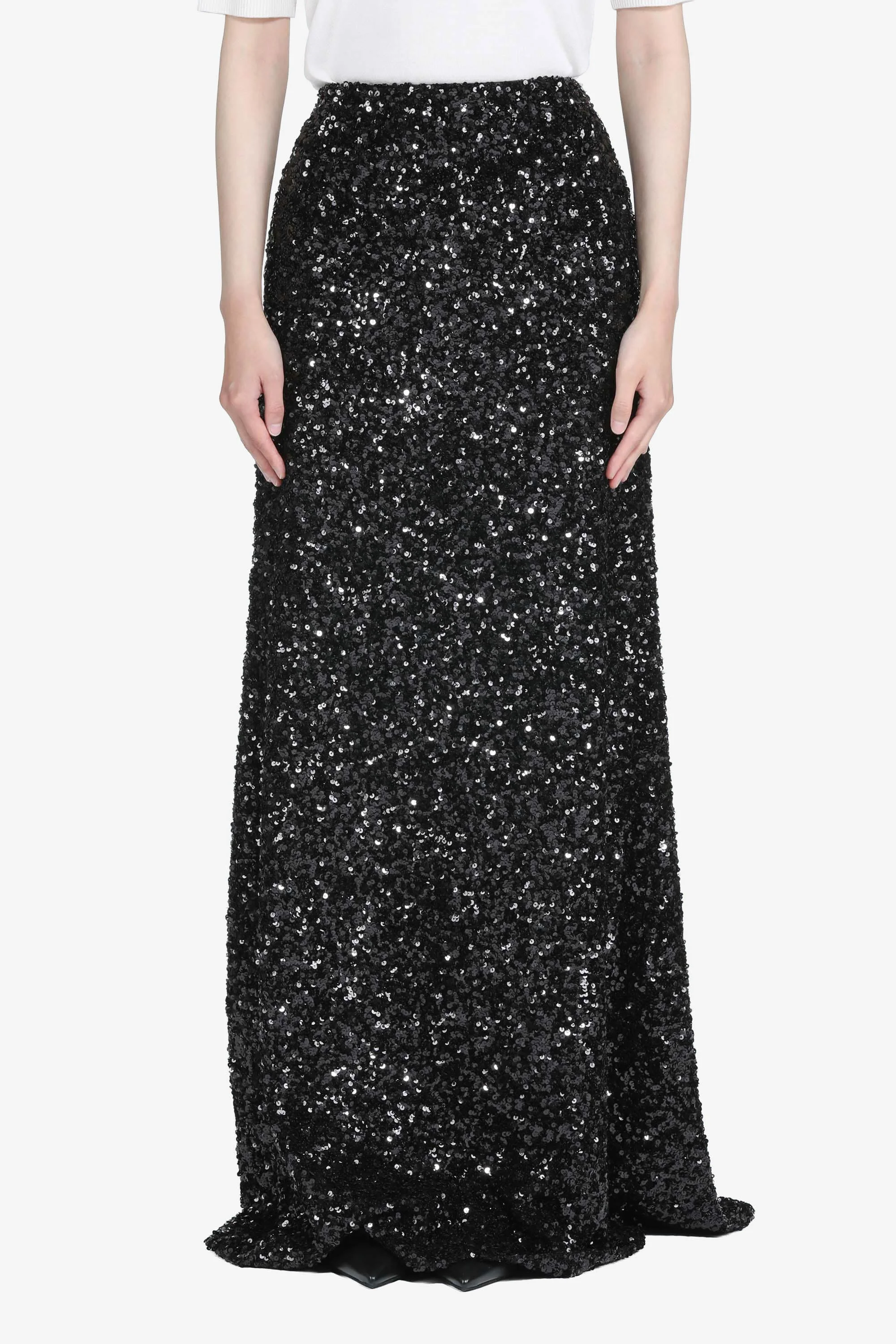 Long skirt made of fabric covered in shiny black sequins. Floor-length and straight-cut, it reaches the hem. The sequin finish creates a shimmering effect. Side pockets and a back zip. DETAILS Color: Black Composition: 100% PL Product Code: 26EN2M0C13159759000 Made in Italy SIZE AND VESTIBILITY La modella indossa la taglia 40 ed e alta 176 cm. Il capo veste regular.