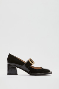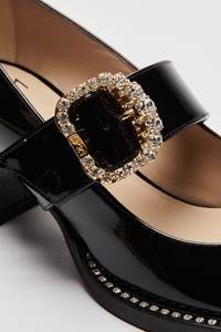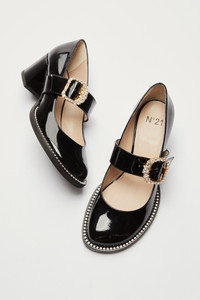 These Mary Janes with a heel and rhinestones are crafted from shiny black patent leather with a decorative buckle embellished with rhinestones. They have a classic shape with a rounded toe and a medium-height block heel for excellent stability. The construction includes a sole with rhinestone details along the edge, adding a touch of elegance without sacrificing comfort. The strap design across the instep ensures a secure fit. DETAILS Color: Black External composition: 100% CALF LEATHER Product Code: 25IGPMJ001VE1N001 Made in Italy SIZE AND VESTIBILITY Heel size: 60