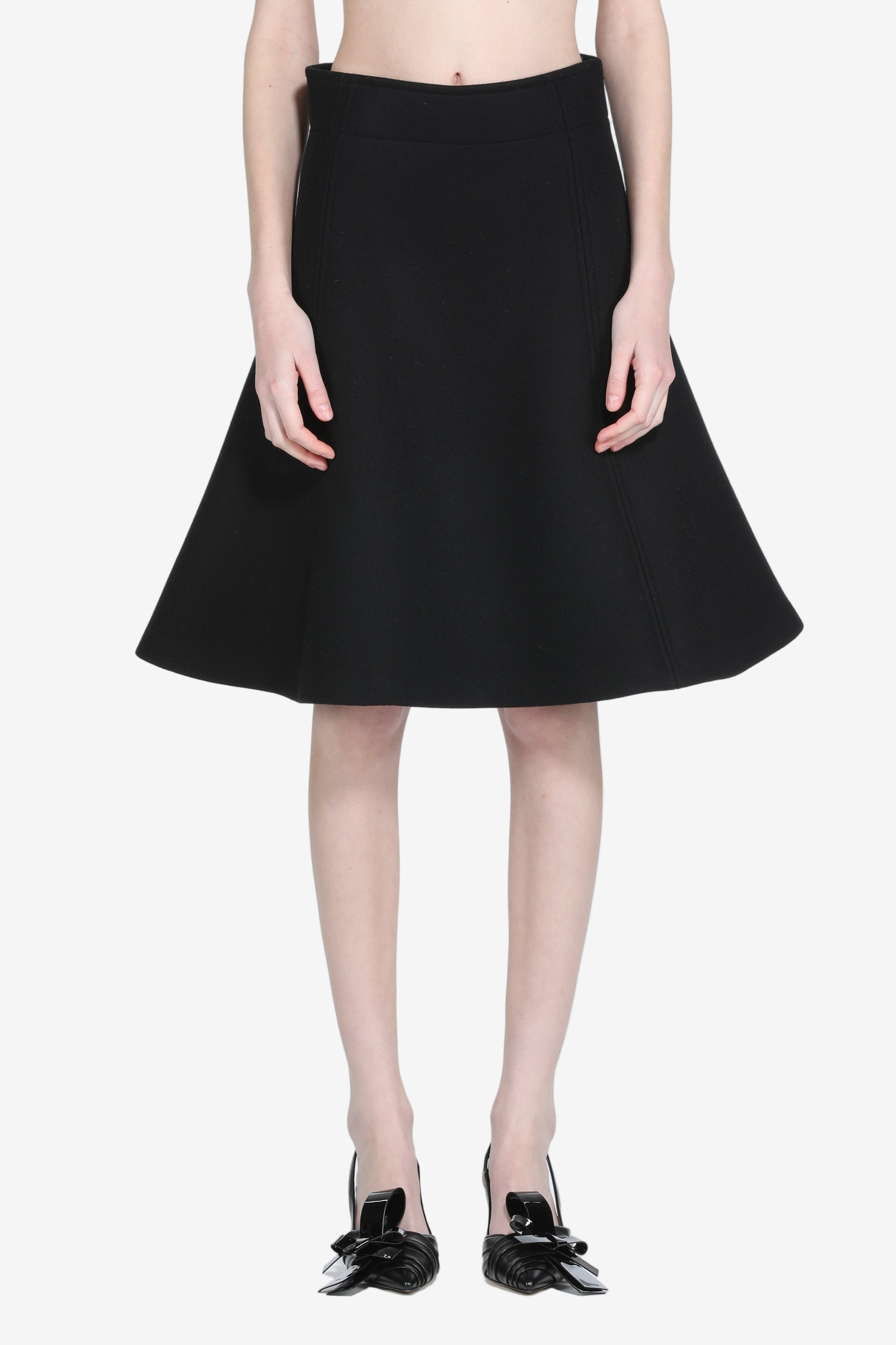 Midi skirt made of wool cloth, featuring a loose, flowing fit. The fabric is durable and offers excellent comfort. It features detailed stitching that enhances the shape. The skirt has a high waist, ensuring a flawless fit. DETAILS Color: Black Composition: 75%WV 25%PA Product Code: 25IN2S0C07130289000 Made in Italy SIZE AND VESTIBILITY The model wears size 40. The garment fits regular.