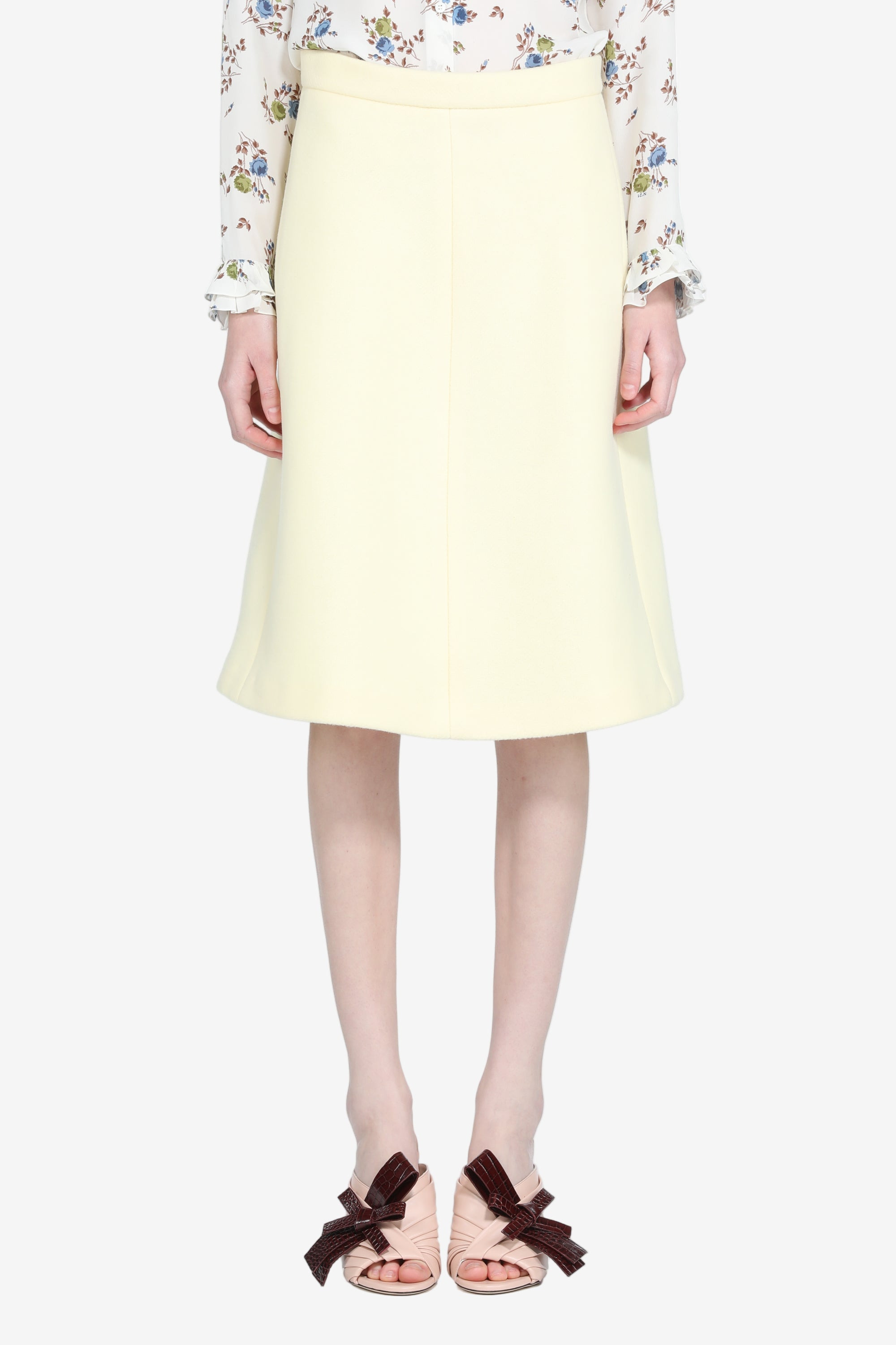 Wool midi skirt, crafted from a soft and warm fabric. It features a regular fit that falls gently above the knee, with an A-line silhouette. The back zip closure ensures an easy fit. Pale yellow. DETAILS Color: Light Yellow Melange Composition: 80%WV 20%PA Product Code: 25IN2S0C05131003942 Made in Italy SIZE AND VESTIBILITY The model wears size 40. The garment fits regular.
