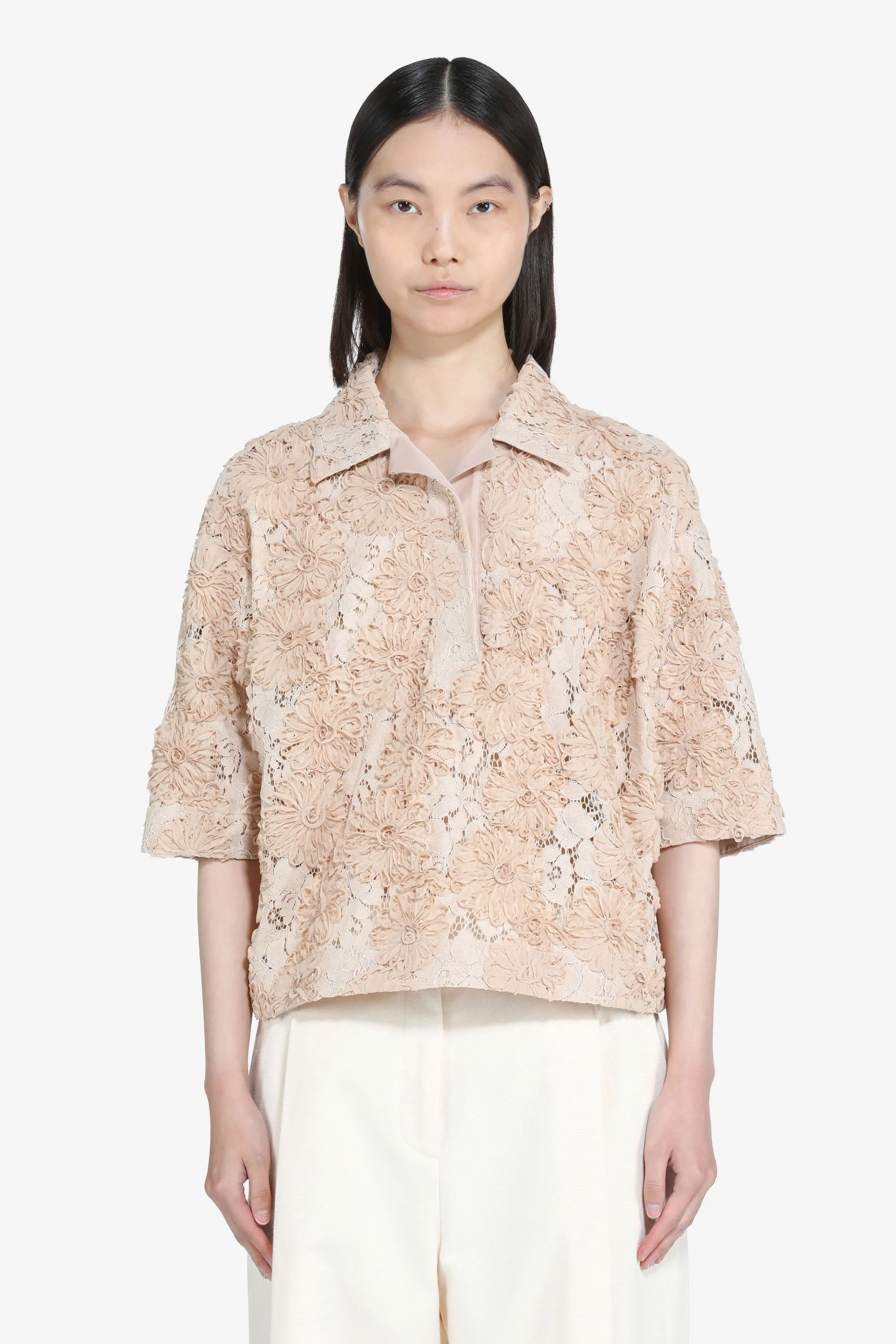 Oversized lace polo shirt with a floral motif. Blush pink. Straight fit with three-quarter sleeves and a polo collar. The workmanship is made with embroidered lace and is lined. DETAILS Color: Powder Composition: 50% PA 50% PL Product Code: 26EN2M0G08252594151 Made in Italy SIZE AND VESTIBILITY The model wears size 40 and is 176 cm tall. The garment fits oversized.
