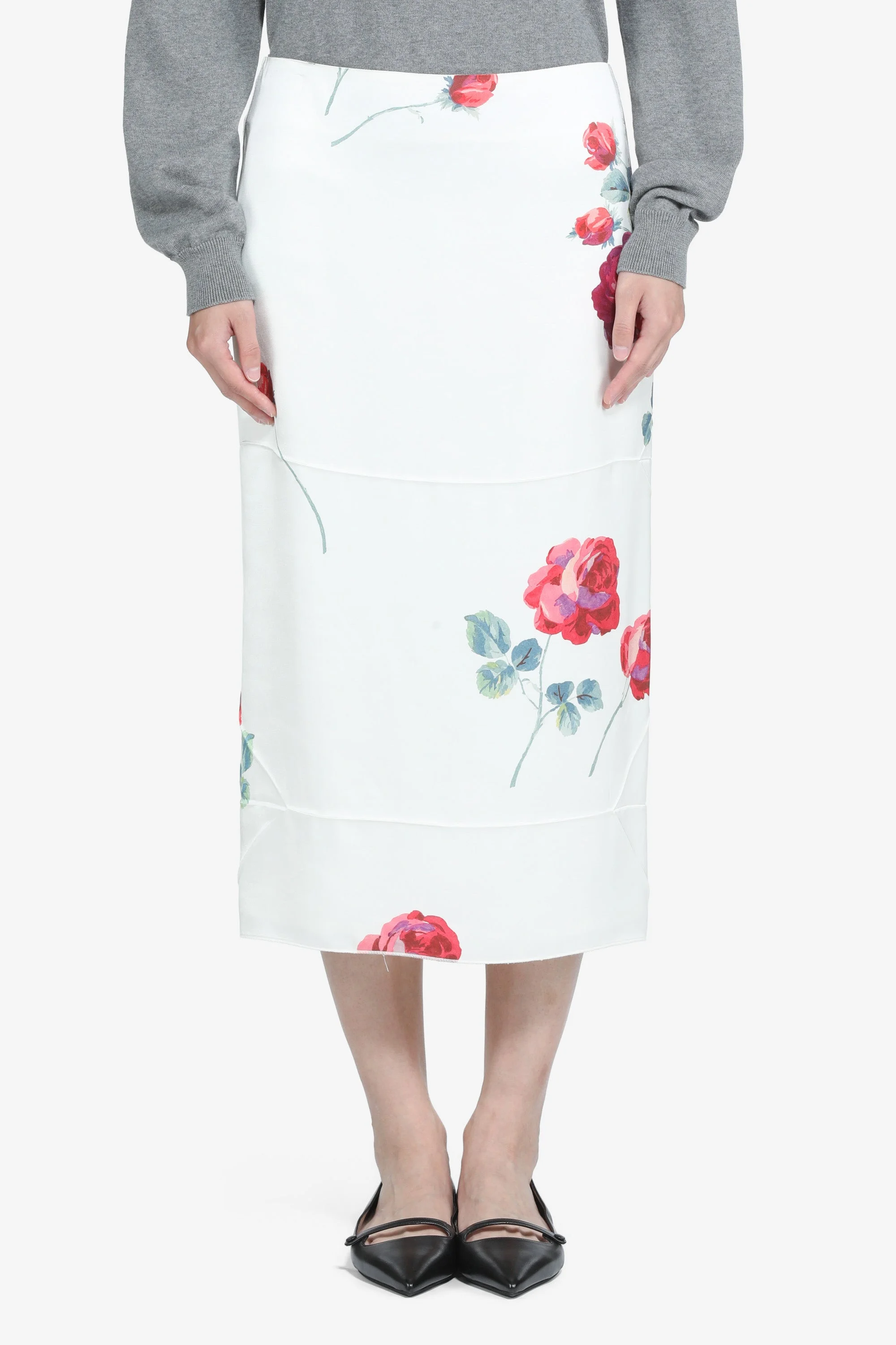 Pencil skirt with a floral print on a white background. The print features red roses and green leaves. Midi length, below the knee, fitted cut, and a back slit. The paneled construction with visible seams defines the silhouette. DETAILS Color: White Background Print Composition: 100% VI Product Code: 26EN2M0C0335286S1M1 Made in Italy SIZE AND VESTIBILITY The model wears size 40 and is 176 cm tall. The boss fits regular.