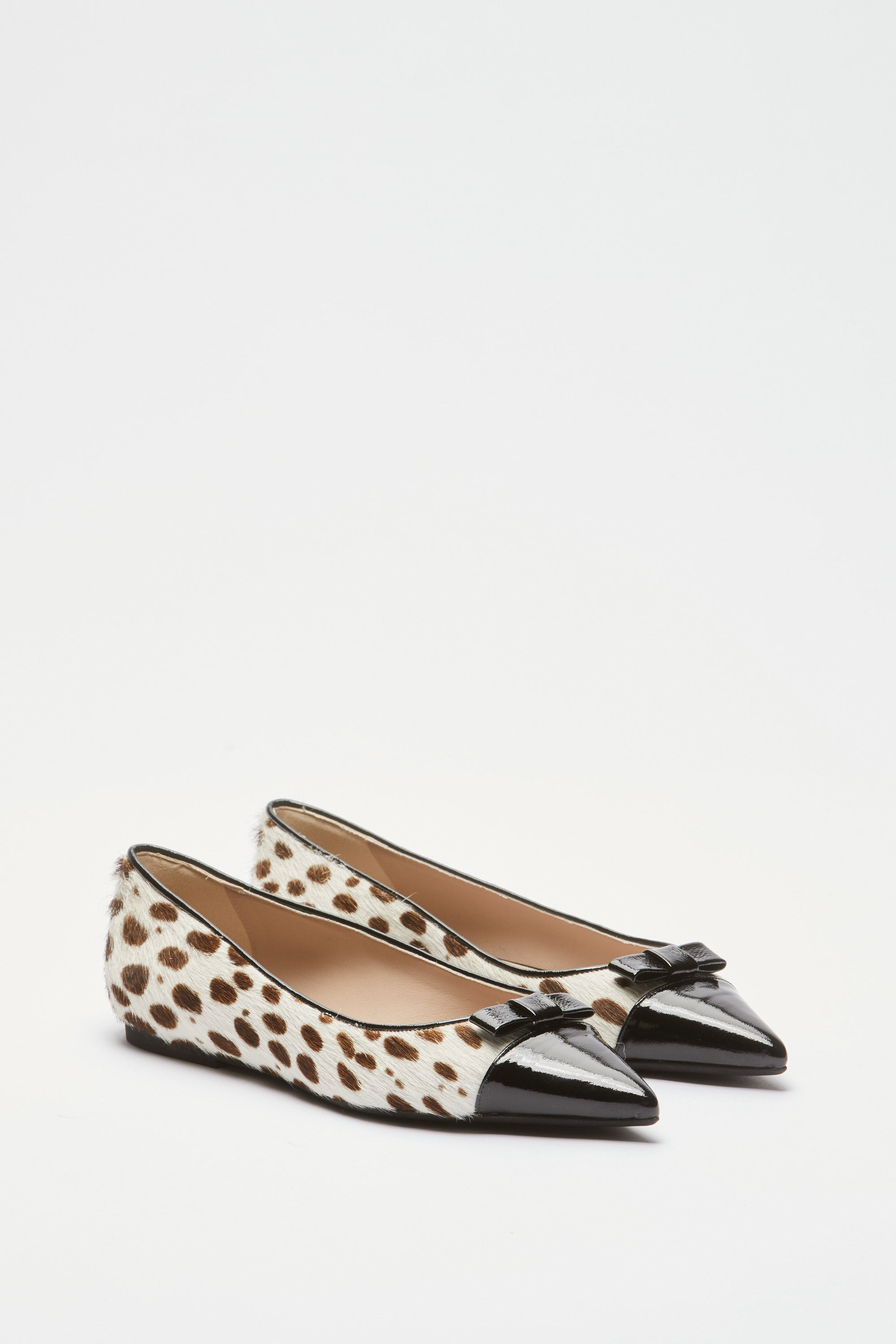 The pointed-toe ballerina with an animal print is crafted from a spotted upper and features a shiny black patent leather toe. The shoe has a tapered shape and a low cut for a snug fit. The flat construction with a thin sole is ideal for everyday comfort. The bow detail on the toe adds an elegant touch. DETAILS Color: Animal Print External composition: 100% CALF LEATHER Product Code: 25IGPBL017CDNX001 Made in Italy SIZE AND VESTIBILITY Heel size: 10