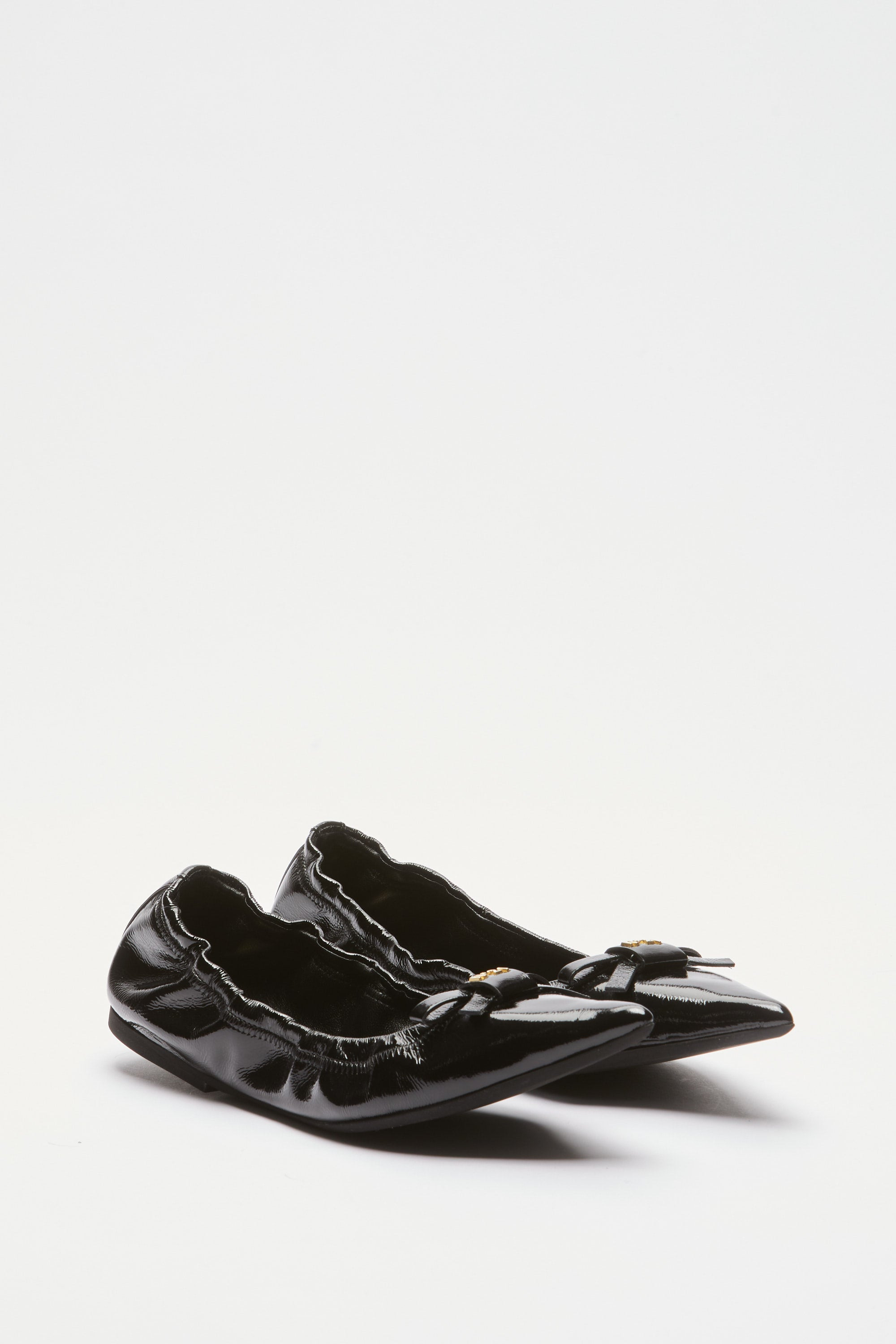 The pointed ballerinas with bow and logo are made of shiny black material with a thin and snug structure that hugs the foot. They have a pointed toe and a decorative bow on the upper, enriched by a small metallic logo. The sole is flat and flexible, ensuring comfort and practicality. DETAILS Color: Black External composition: 100% CALF LEATHER Product Code: 25IGPBL009NK1N001 Made in Italy SIZE AND VESTIBILITY Heel size: 10
