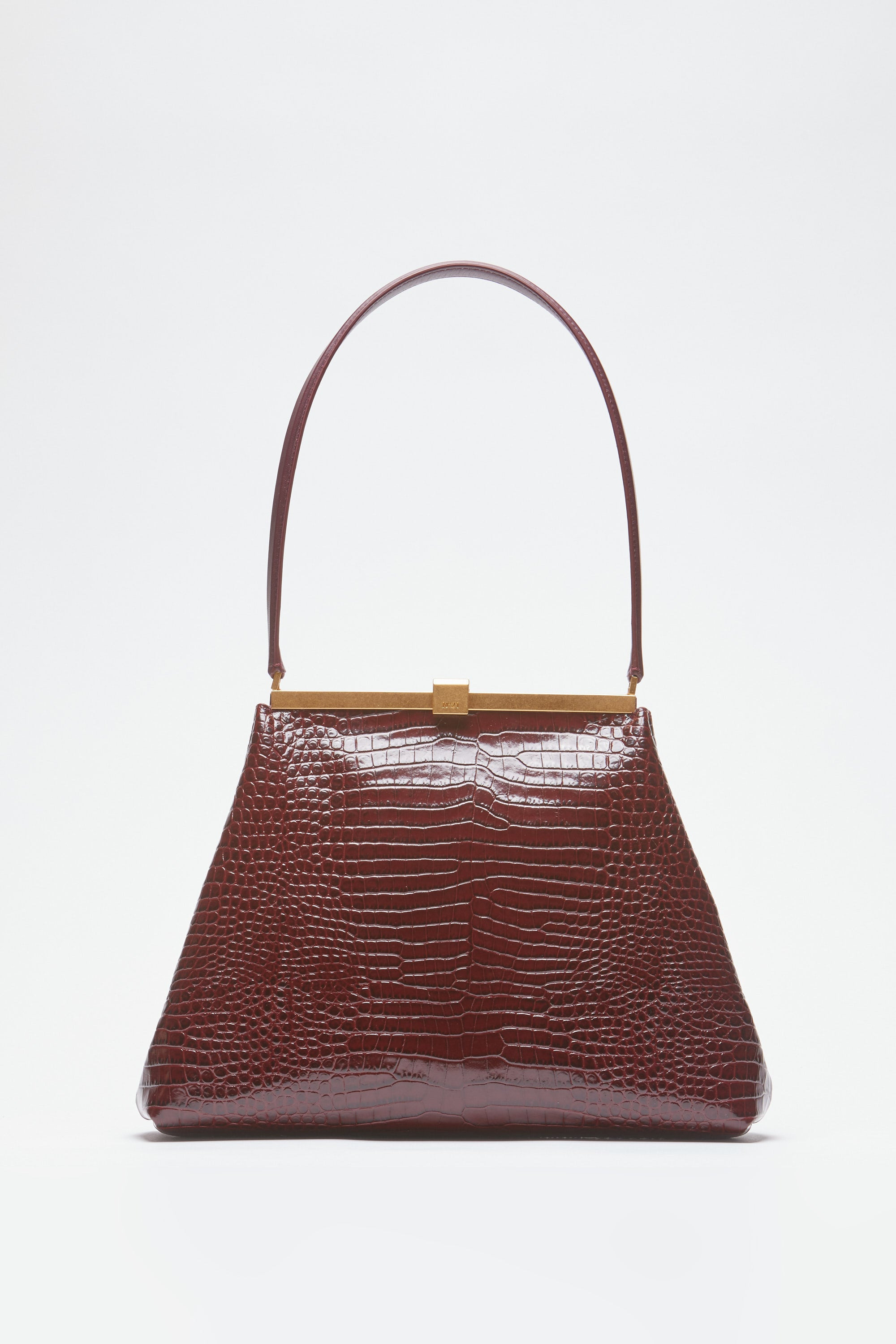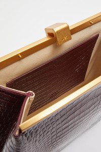 The Puffy Jeanne leather shoulder bag is crafted from leather with a crocodile-effect finish. It features a geometric shape and a long handle, making it comfortable to carry over the shoulder. The gold-tone metal clasp adds an elegant touch to the design. DETAILS Color: Bordeaux External composition: 100% COW LEATHER Product Code: 25IBS0993CC01R005 Made in Italy SIZE AND VESTIBILITY Measurements: 21-33x25x8