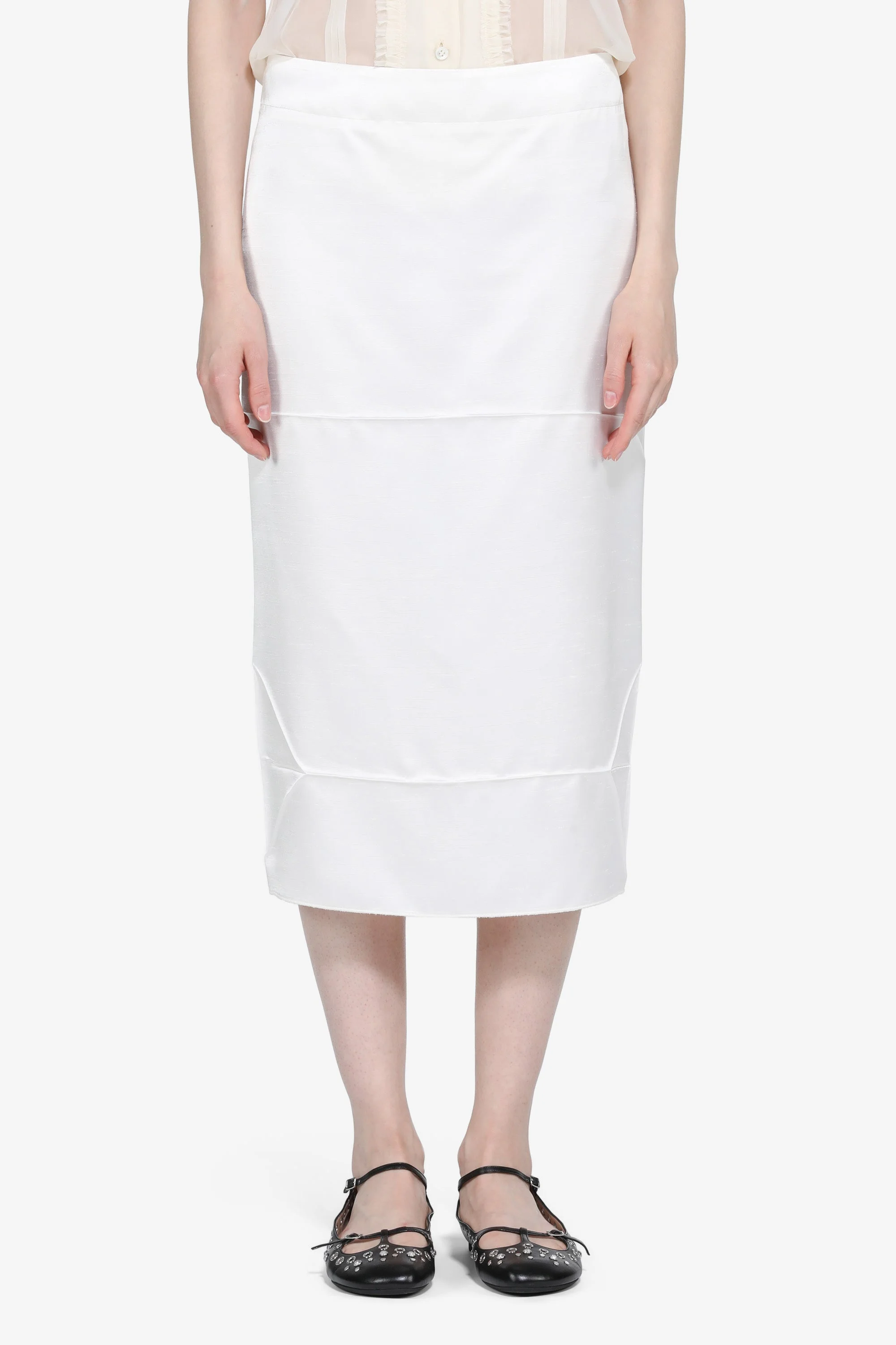 White satin pencil skirt. Satin fabric with a shiny finish. Fitted, midi-length skirt that reaches just below the knee. DETAILS Color: Albumen Composition: 100% VI Product Code: 26EN2M0C03159801111 Made in Italy