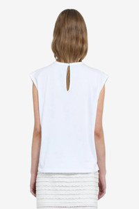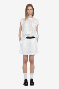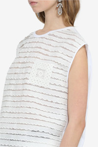 Sleeveless top in white lace with wavy stripes. Patch pocket on the chest. Simple crew neck. DETAILS Color: Optical White Composition: 75%CO 25%PA Product Code: 25IN2C0F06141571101 SIZE AND VESTIBILITY FIT TRUE TO SIZE