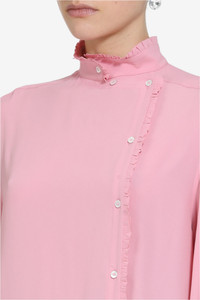 Light pink shirt with side fastening and mini ruffles along the button placket. The garment features a raised collar with ruffles detail and long sleeves with cuffs closed by covered buttons. The fit is regular with a straight line and rounded bottom. DETAILS Color: Pink Composition: 69%AC 31%SE Product Code: 25IN2M0G07251114141 Made In Italy SIZE AND VESTIBILITY The model wears size 40. The garment fits regular.