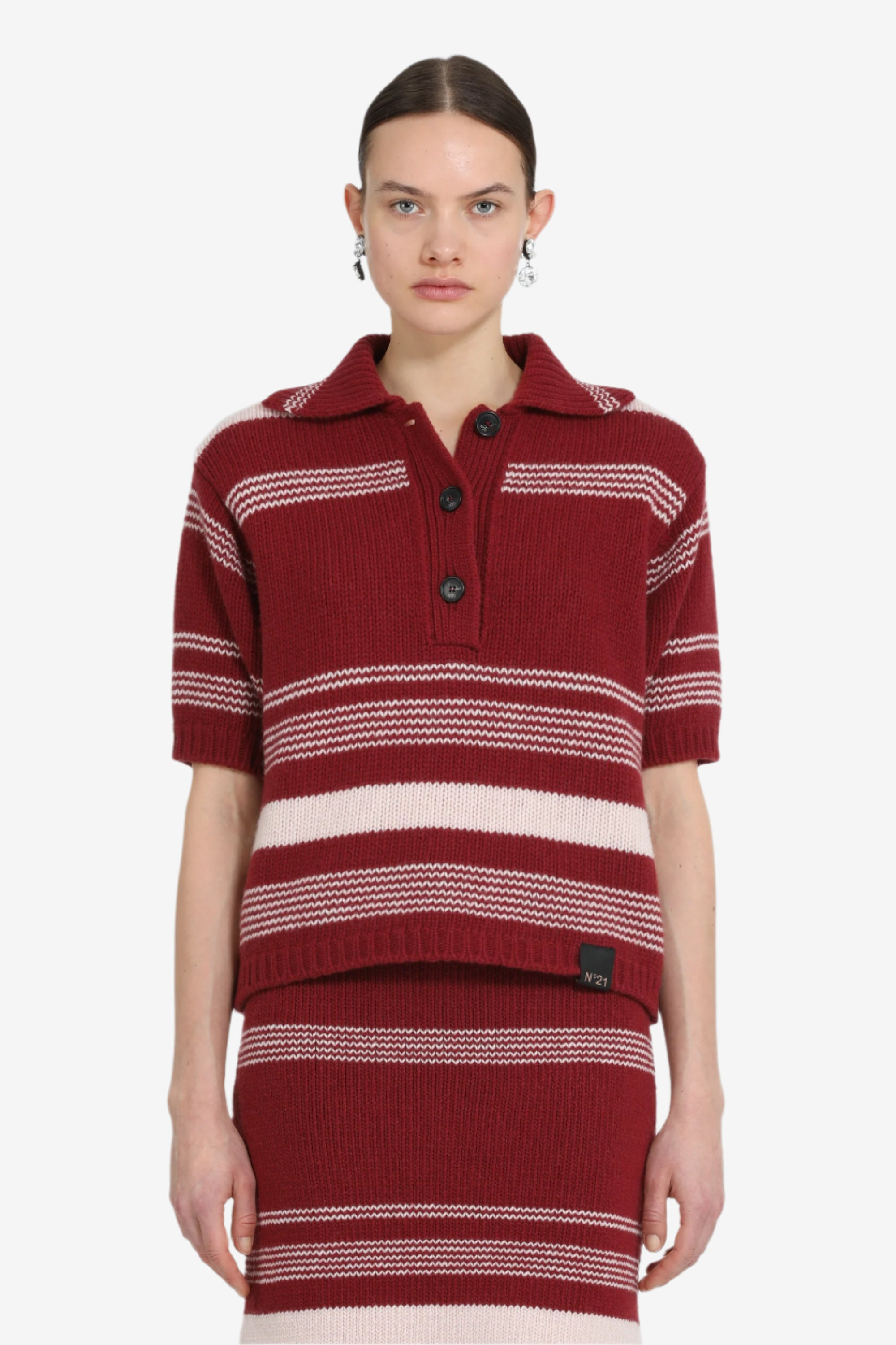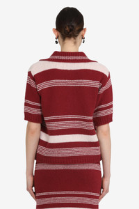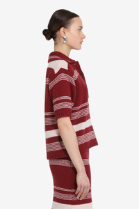 Short-sleeved striped polo shirt made of a medium-weight knit fabric, featuring horizontal stripes in contrasting colors. The regular fit features short sleeves and a polo collar with front button closure. The hem and cuffs are ribbed for better shape retention. DETAILS Color: Dark Red Composition: 100%WV Product Code: 25IN2M0A01070814601 Made in Romania SIZE AND VESTIBILITY The model wears size 40. The item fits oversized.