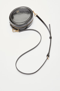 The Tamburello shoulder bag is crafted from black patent leather with gold hardware. It has a compact, rounded shape and a zip closure. The adjustable shoulder strap allows for comfortable carrying on the shoulder or across the body. The rigid structure ensures protection for the contents and a sleek look. DETAILS Color: Black External composition: 100% CALF LEATHER Product Code: 25IBP0989NK01N001 Made in Italy SIZE AND VESTIBILITY Measurements: 17x14.5x7