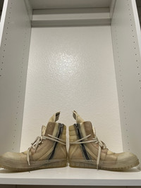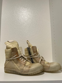 CONDITION : ALMOST NEW, Condition photos are included. Dustbag included, have a few sitting around as well. ITEM SHIPS SAME OR NEXT BUSINESS DAY UNLESS NOTED IM ON VACATION DESCRIPTION: RICK OWENS SS23 EDFU GEOBASKET IN NATURAL TRANSPARENT COW LEATHER THESE GEOBASKETS ARE ABOVE-ANKLE HEIGHT. THEY HAVE SEVEN EYELETS WITH LACES, AN EXTENDED TONGUE, A ZIPPER ON THE INSIDE ANKLE FOR EASY FASTENING, GEOMETRIC SEAMS WITH TOPSTITCHING AND SHARK-TOOTH SOLES. THIS SEMI-TRANSPARENT LEATHER IS INSPIRED BY PARCHMENT. IT IS MADE USING A SPECIALIZED GLYCERINE TREATMENT AND HAS A SOFT AND OILY HAND FEEL. * COLOR: NATURAL AND NATURAL CLEAR SOLE * MATERIAL: UPPER 100% CALF LEATHER * DETAIL 100% CALF LEATHER * LINING 100% CALF LEATHER * INSOLE 100% CALF LEATHER * SOLE 100% THERMOPLASTIC RUBBER SOLD OUT Retail: $1,400