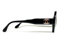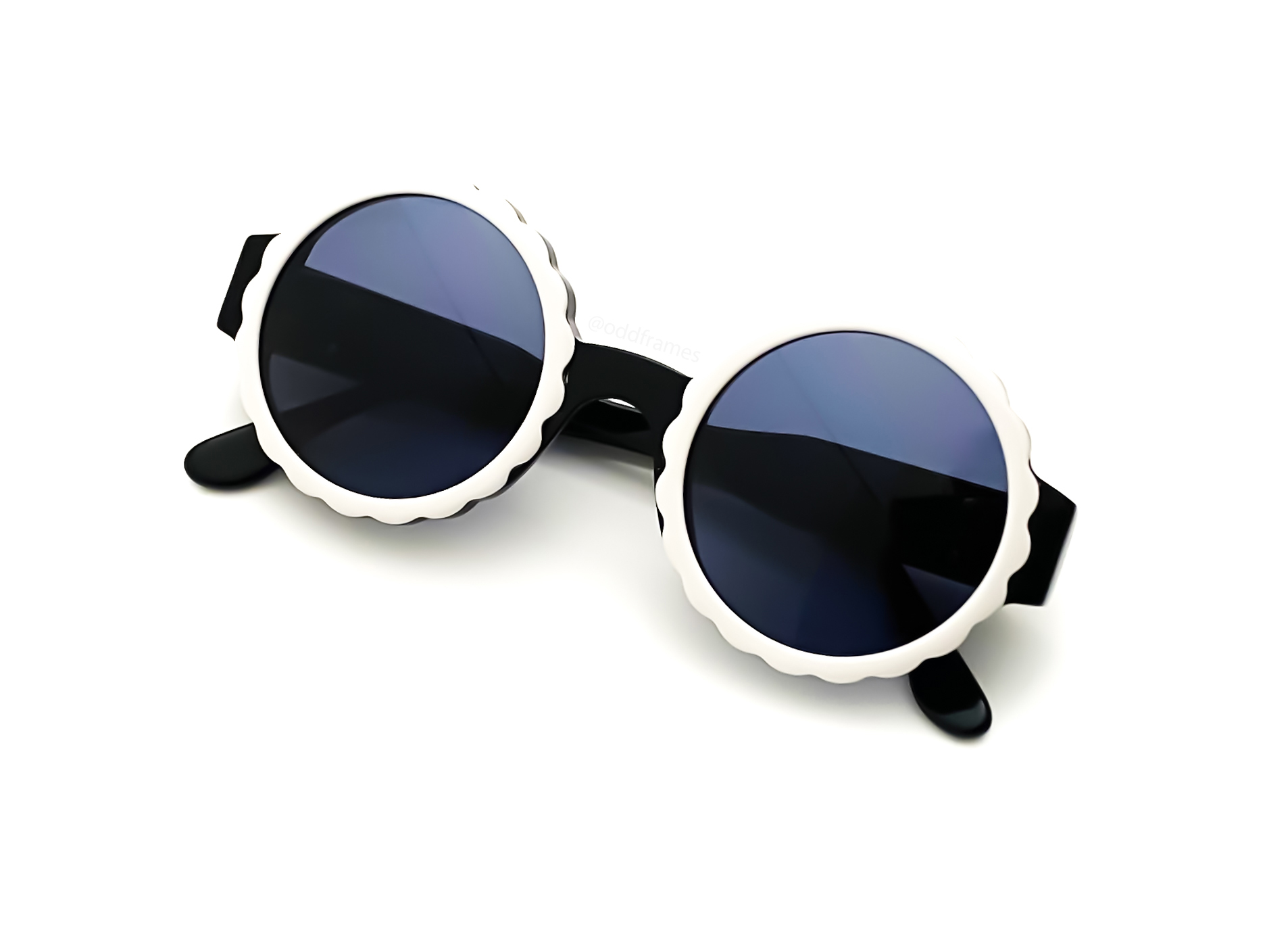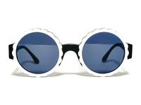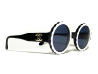 CHANEL round black sunglasses with white scalloped pattern circle from 1994. Model 03524 C0229. Designed by Karl Lagerfeld. As seen on runway model Christy Turlington. And rapper Takeoff. Images by Vogue and Numero Magazine. New old stock / Unworn Made in Italy. One size. Case Included (not vintage but authentic Chanel)