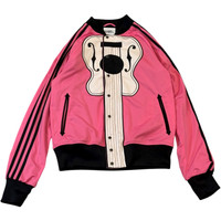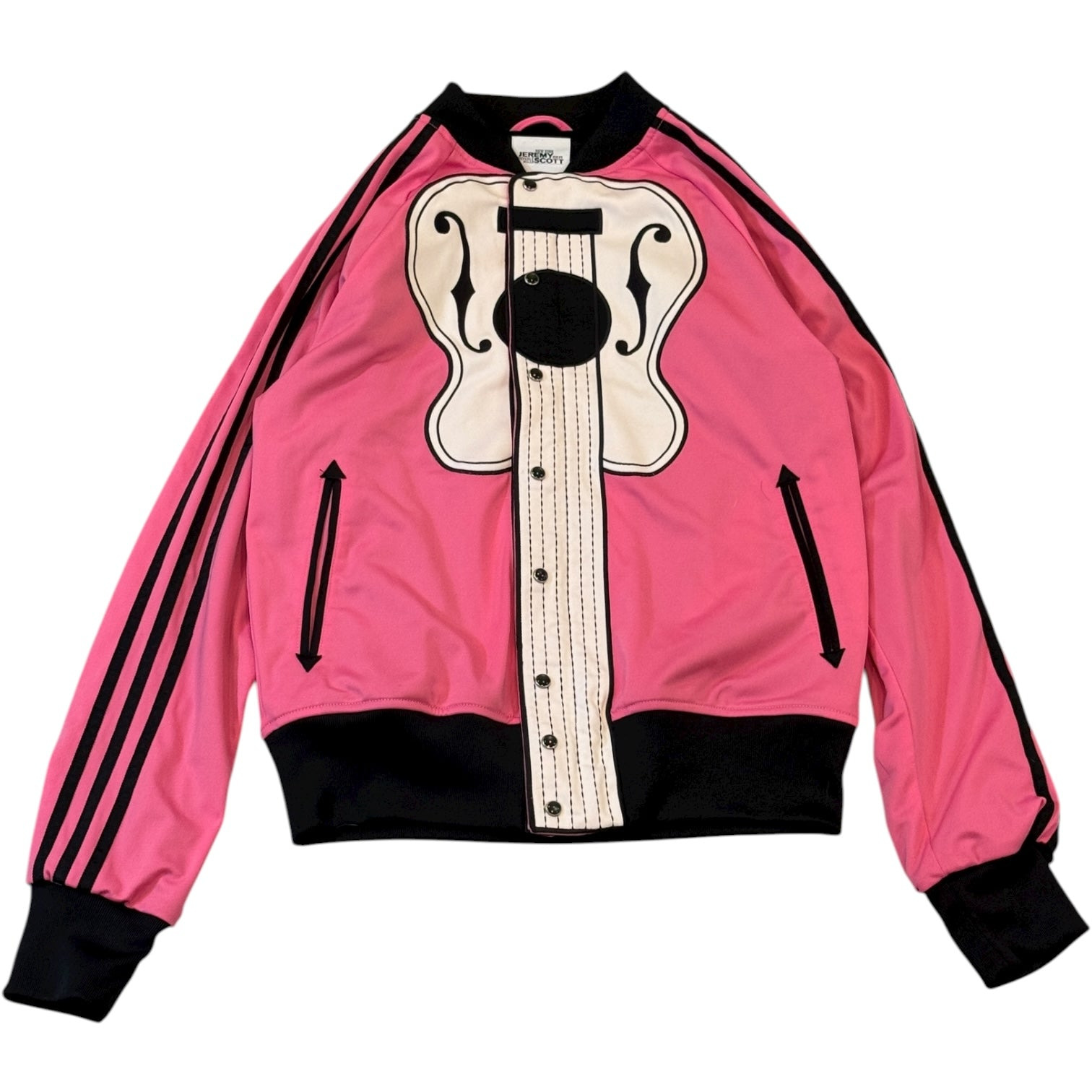 Jeremy Scott X Adidas Guitar Over Embroidered Raglan Cut Track Jacket in Pink. Zip and snap button front closures with two double welted external pockets, a back embroidery and a central guitar motif, highlighted by Adidas three-stripes down the sleeves. No flaws at all, tagged size M measures 20.5 pit to 30.5 sleeves to neck 25.75 length.