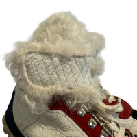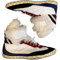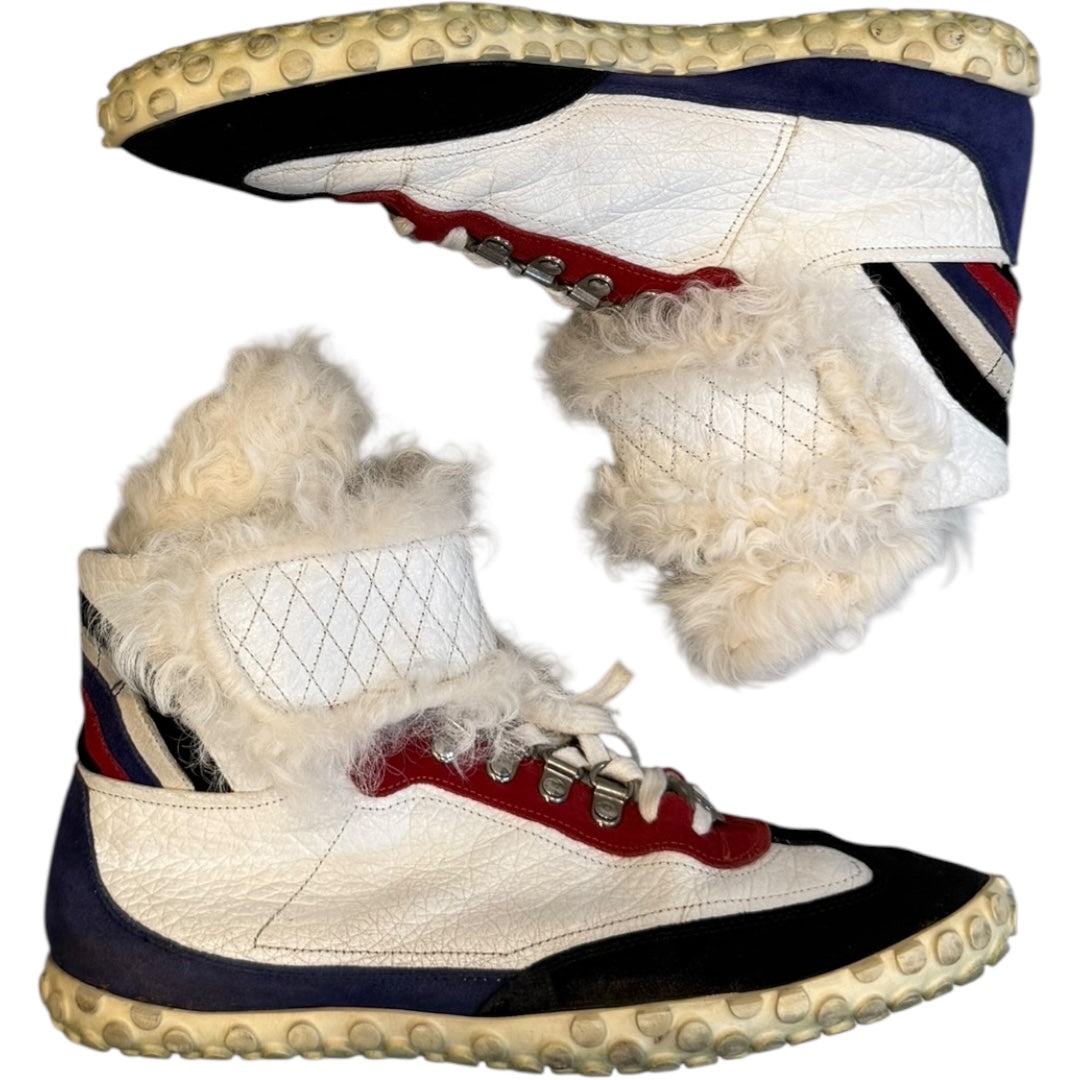 Balenciaga High-Top Shearling Strap Trainers in White Grained Calfakin with Suede Panelling, fit US8-8.5. A gorgeous model from the Balenciaga archive featuring metal hiking style lace loops on an incredibly luxurious trainer highlighted by long shearling panelling and a quilted strap closure. in good shape with minor dirt due to age, no damages