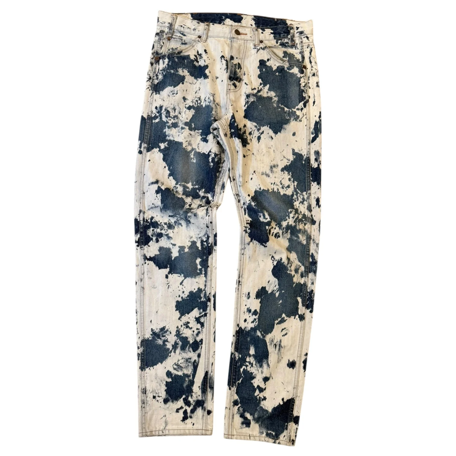 Celine by Hedi Slimane SS2021 ‘Running Kids’ Denim, a bleach patterned heavyweight denim with classic Italian 5 pocket construction on a slim straight model/. 32.5 Waist 34 inseam 10 back 13.5 8 leg opening. No flaws