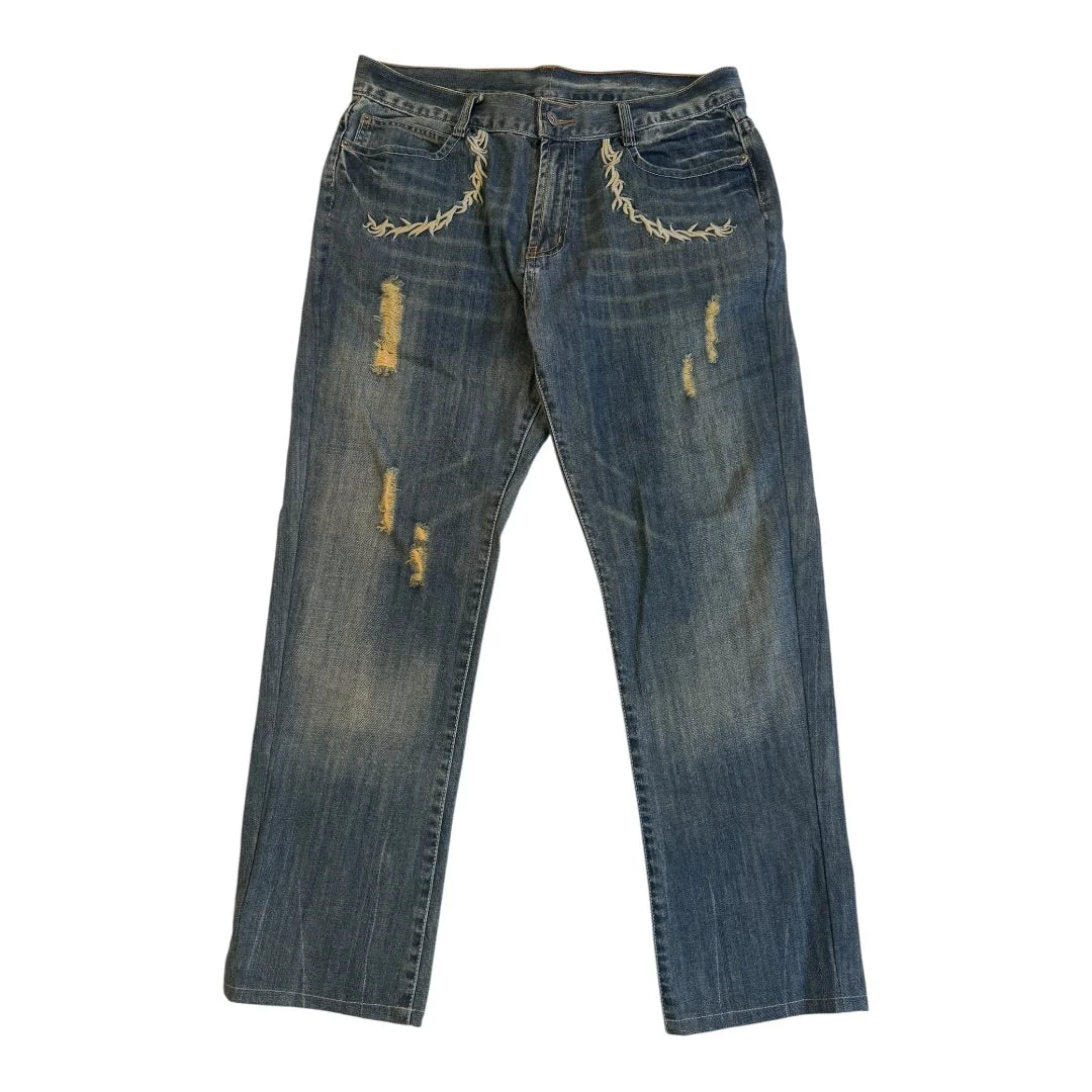 D&G Embroidered Distressed Denim waist 34 rise 11.5 back rise 13.75 inseam 28.75 leg opening 8.5. In good used condition with no noticeable flaws.