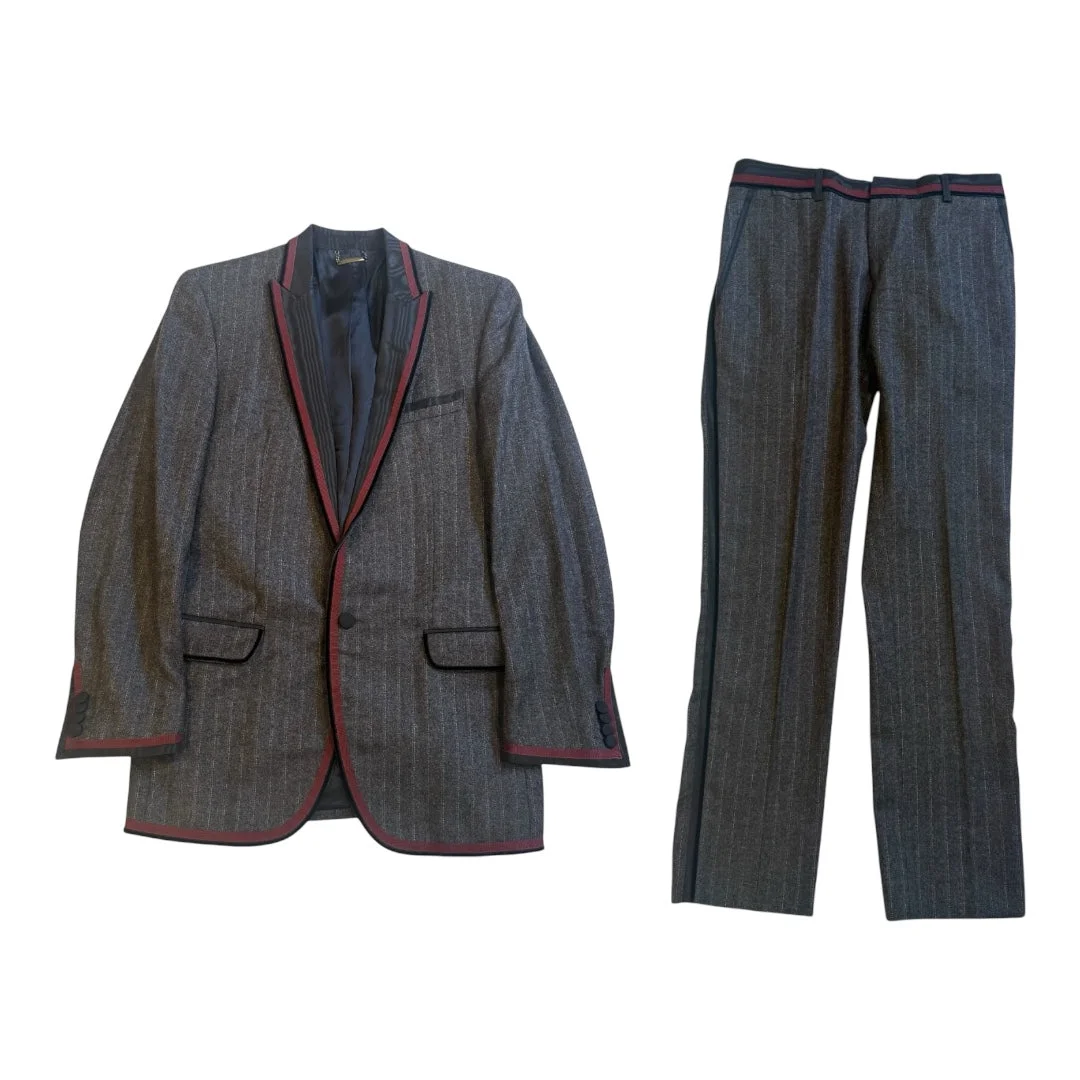 D&G Two-piece Suit in Grey Pinstripe Wool with Black and Red accents, tagged size 46 / S fits S-M measures 17 shoulders 19.5 pit to pit 27 sleeves 29 length 31 waist 8.5 rise 11.75 back rise 30.5 inseam 6.75 leg opening. In excellent condition with no flaws.