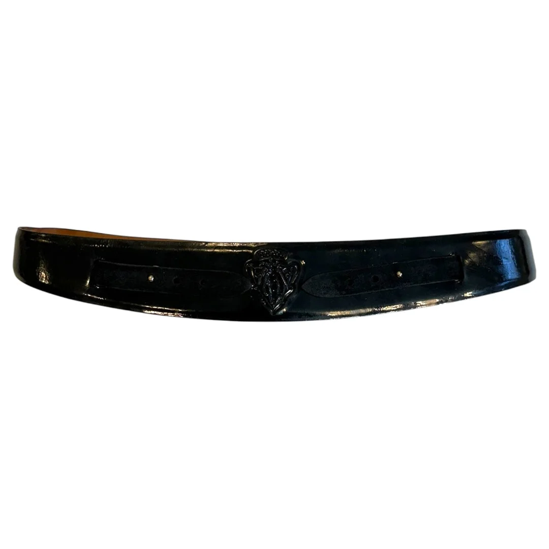 Gucci Two-Piece Wrap Belt in Polished Leather and Calfskin Suede, fits waists 27-30 inches. This archive Gucci design features interlocking straps and a curved shape meant to fit the waist ergonomically, utilizing a buttery calfskin suede and polished leather to contrast between the separate pieces. In good condition with slight damage to suede near one belt loop and metal notch, not visible when worn, shown in fourth photo.