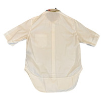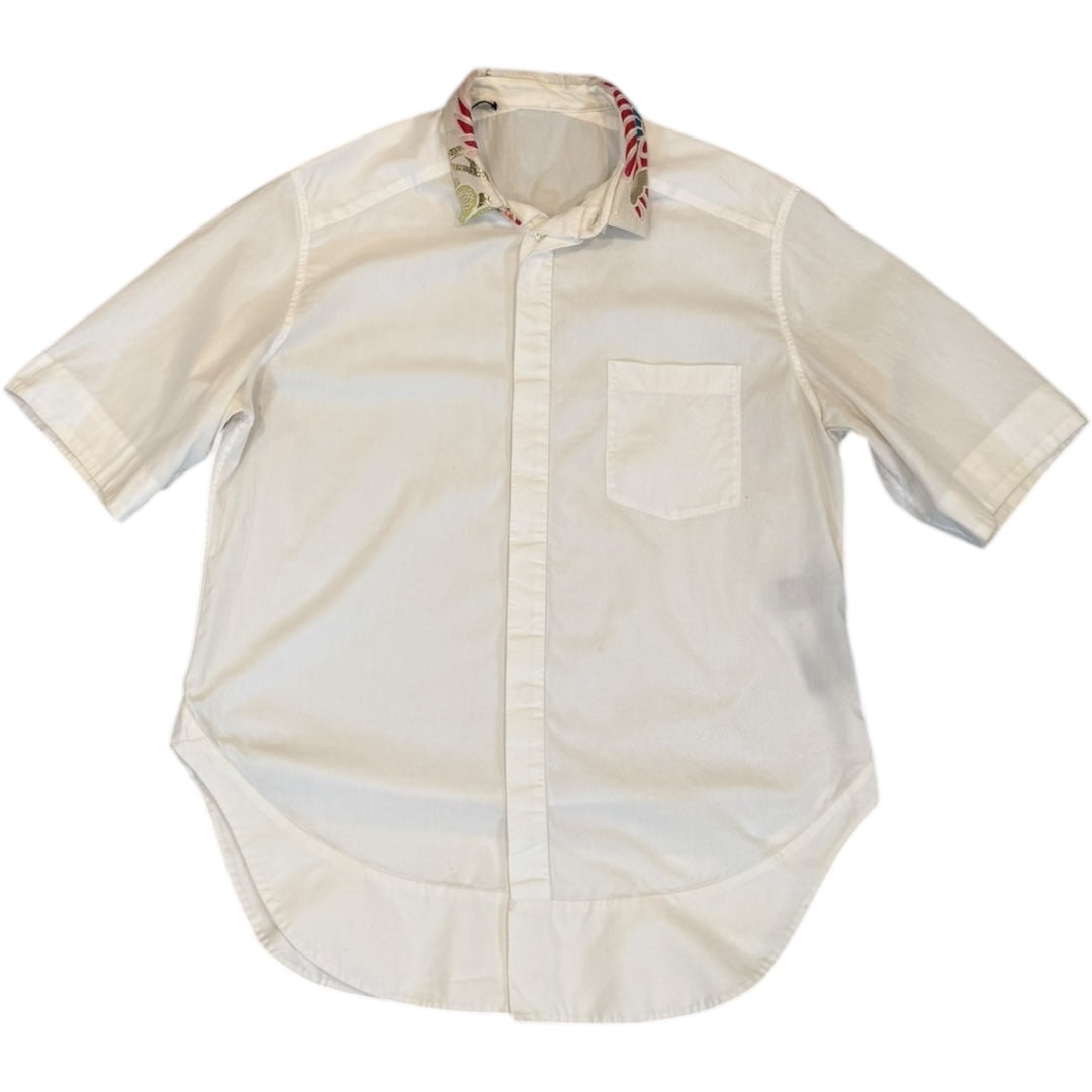 Haider Ackermann Jacquard Silk Collar Short Sleeve Shirt, white. Measures 21 pit to pit 17 shoulders 27 length. Small discoloration at front placket visible in photos and small hole developing in underside of left armpit, not visible when worn or affecting wear and reflected in price.