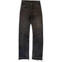 Helmut Lang Spring 2003 Tire Print Denim in Black 100% cotton with Black Rubberized Print. In beautiful used condition with released hems and unique patina developing. Some damage to back left pocket from wear. Tagged 27 measures 28 waist 9 rise 12.5 back rise 32 inseam 7 leg opening