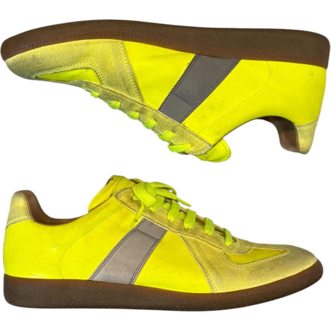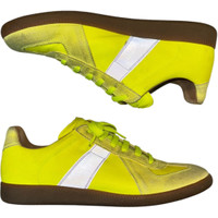 Maison Margiela ‘Dirty Tennis Ball‘ German Army Trainers size 41/US8 fits US8-9. This vibrant Lambskin sneaker uses 3M striping and a predistressed fuzzy calfskin suede toe to replicate a used tennis ball. In great used condition with minor wear, some intentional distressing to suede, no heel drag. No box