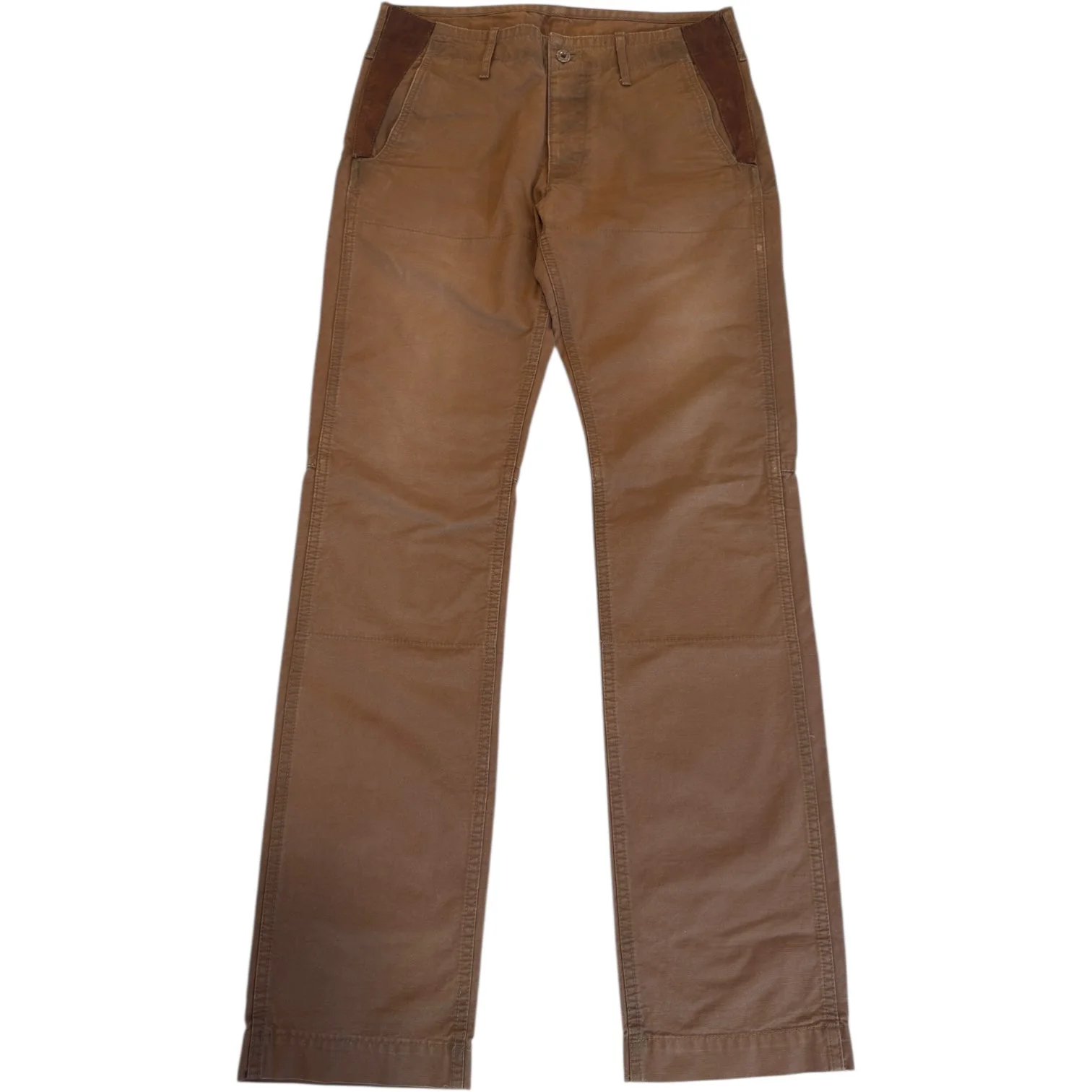 Isamu Katayama BACKLASH Cotton Canvas, Cowhide and Lizard-skin Distressed Work Pants in Brown, tagged size M waist measures 32 front rise 11.75 back rise 14.75 inseam 33 leg opening 8. Two beige lizard-skin flap pockets at rear with snap closures, accented by tonal cowhide front pocket accents, double knee stitching and a reinforced seat.