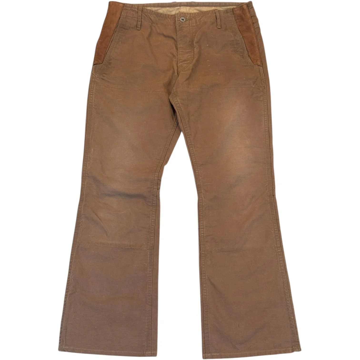 Isamu Katayama BACKLASH Distressed Canvas Bootcut Pants with Cowhide and Lizard Accents. Tagged size M, waist measures 33 rise 10 back rise 12.5 inseam 30 leg opening 9
