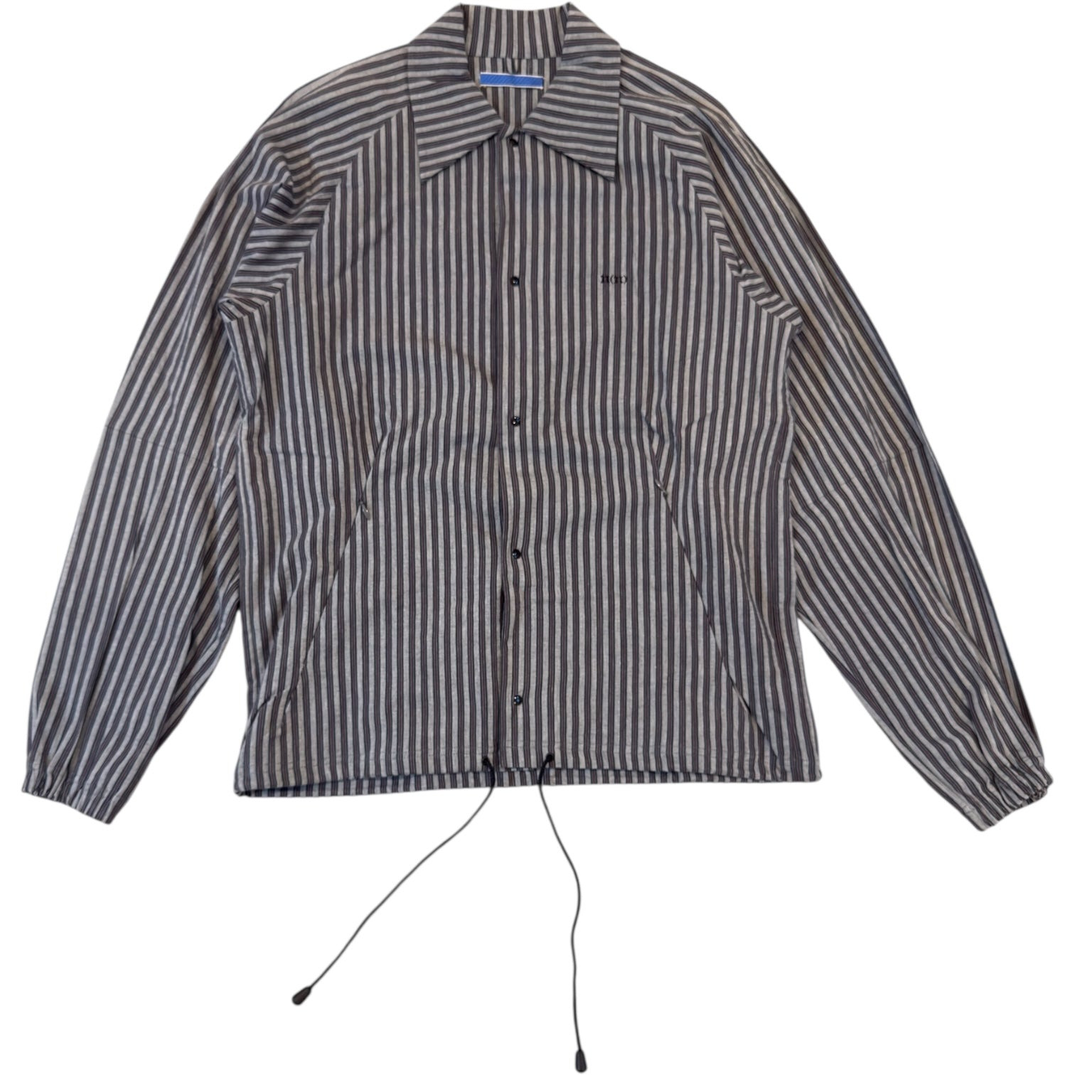 Number (N)ine Spring 1998 Striped Snap Button Raglan Jacket in Grey / Red / Black Stripe, size 2. This sharp collared jacket from Takahiro Miyashita’s Spring 1998 Number (N)ine collection features a darted design with hidden zipper pockets, elasticated cuffs and an adjustable waist. Measures 20 pit to pit, 32 sleeves to neck 26.75 length. Best for M-L. Absolutely no flaws, a truly rare opportunity to purchase some of Number (N)one’s earliest work in impeccable condition.