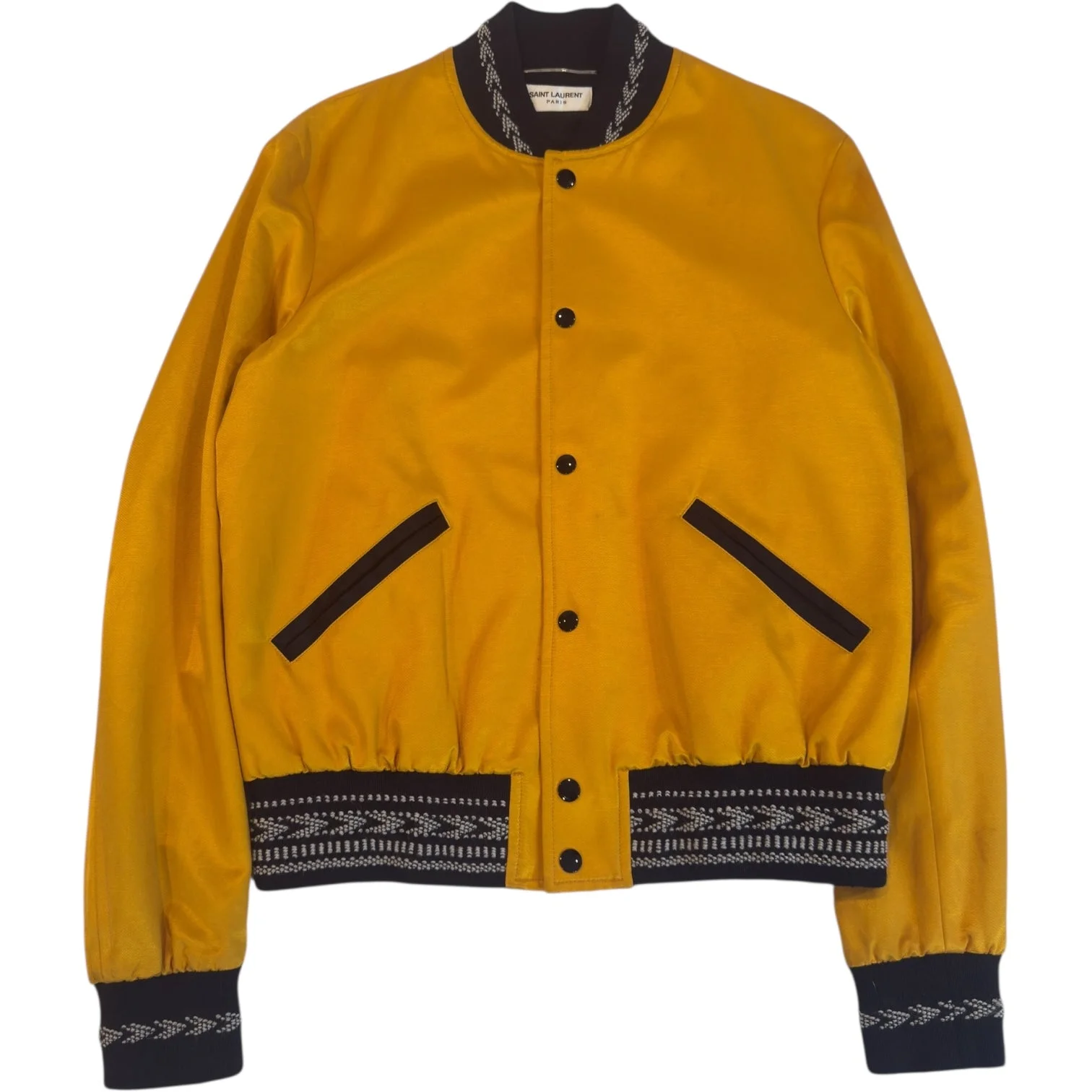 Saint Laurent Paris Ikat Bomber, tagged size 50/L fits slightly slim, measures 21 pit to pit 17.5 shoulders 26 sleeves 25 length. Cotton blend outer with a silky feel and slight shine, fully lined with a raised textured woven at the cuffs, hem and neck. In good condition with some very slight signs of wear, no noticeable flaws.