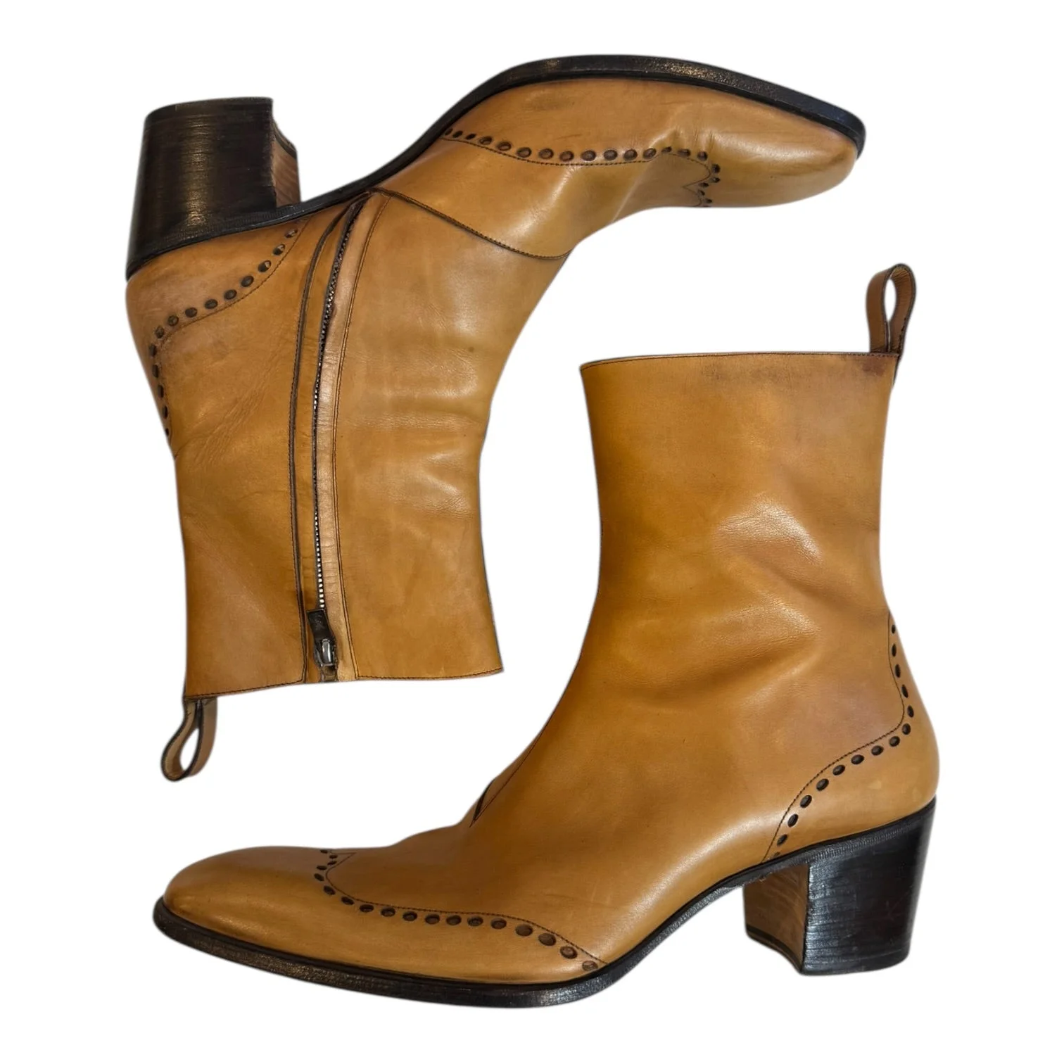 Yves Saint Laurent Rive Gauche Laser-cut Jonny Boots, tagged size 43.5 / US10-5 fits US10.5-11.5. This rare pair from YSL Rive Gauche features a paneled construction, laser-cut at the toe and heels to create a futuristic brogue effect. In excellent used condition with the exception of one water spot on right shaft.