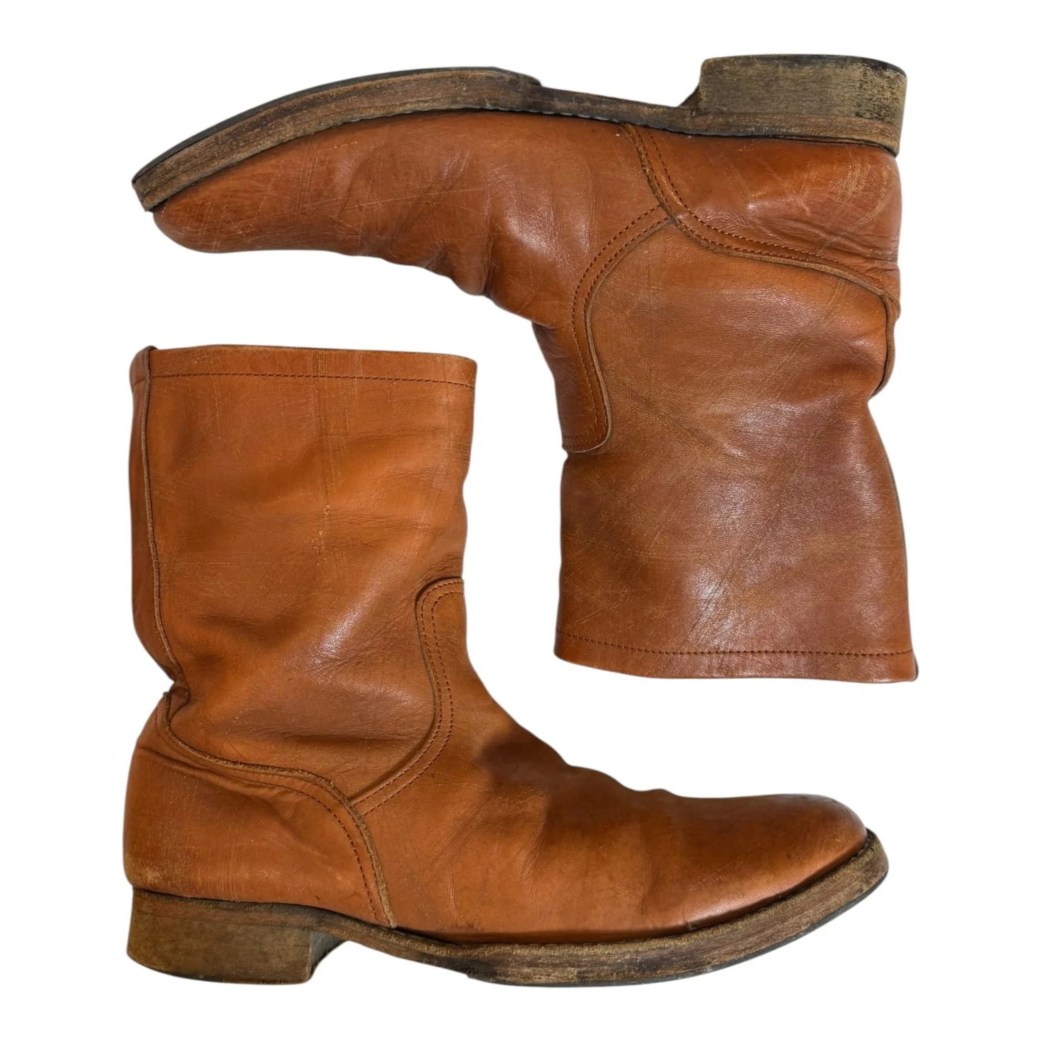 Undercover Spring 2007 Square Toed Slip On Boots, tagged size M fits US8.5-9.5. These boots feature a wide ankle opening and a brown ‘Scratched Lambskin’ upper, a distressed leather used throughout this season. Two waterspots, wear visible at ankle, heel and sole.