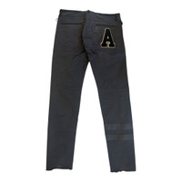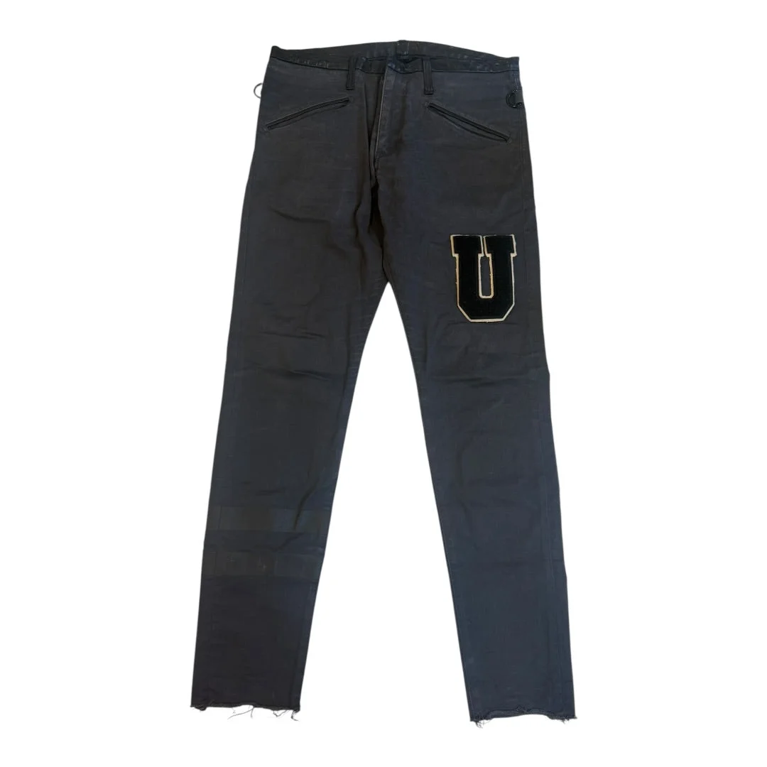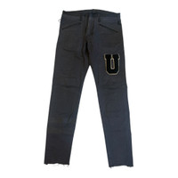 Undercover Leather Trimmed Varsity Patched Pants in Dark Grey with Black Accents. These slim pants from Undercover’s Spring 2018 collection feature two chenille varsity style patches with black screen printing and cowhide accents at the waist and pocket welting. no flaws, tagged size 2 measures 30 waist 9 rise 12 back rise 29 inseam 5.5 leg opening